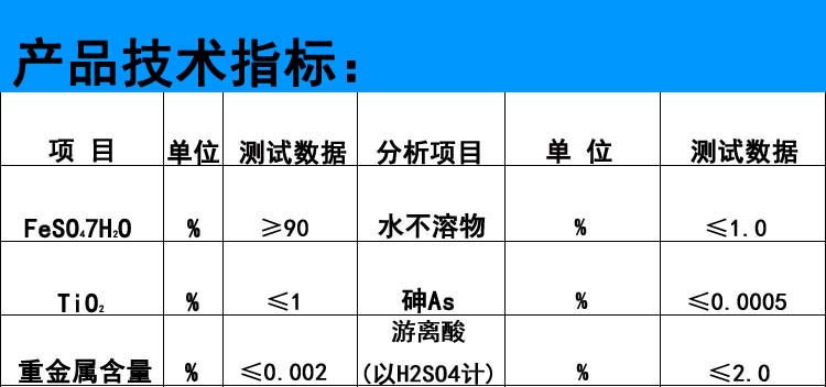 硫酸亚铁又名二水,分子式为FeSO4.7H2O,是硫酸法生产一种稀有金属产品过程中产出的副产品,其外观为淡绿色或淡黄绿色结晶固体。