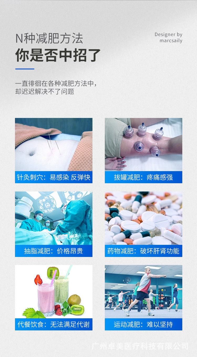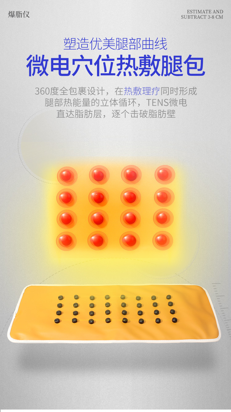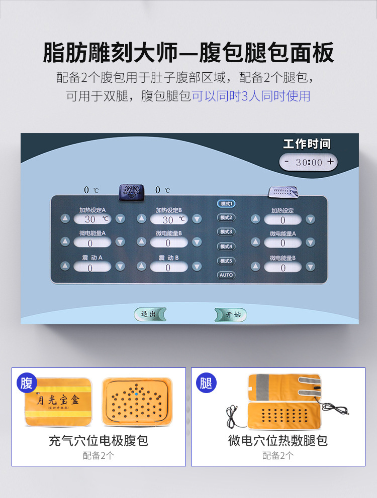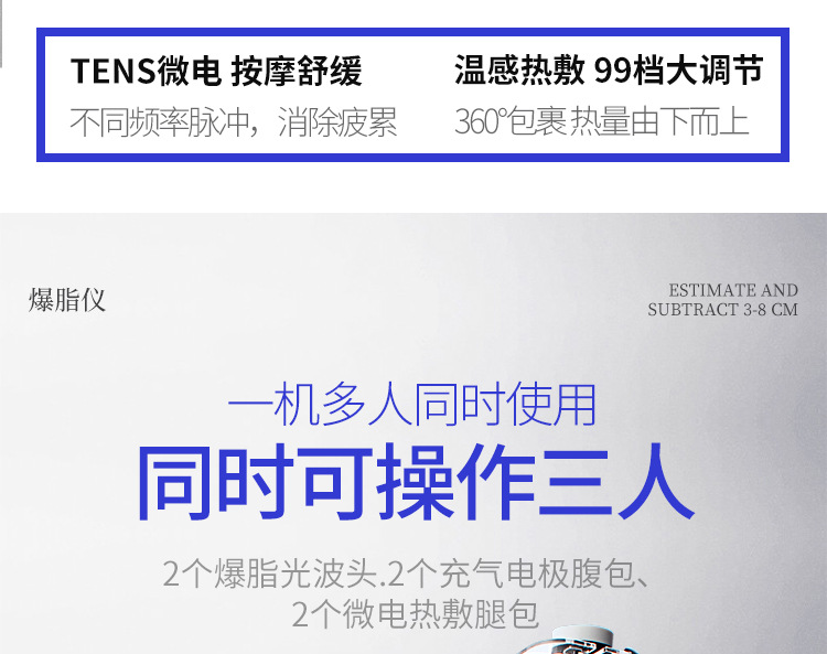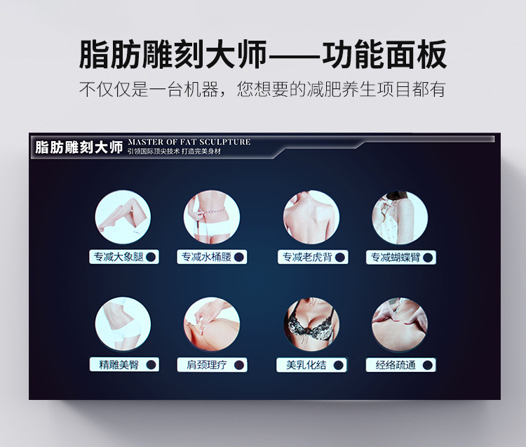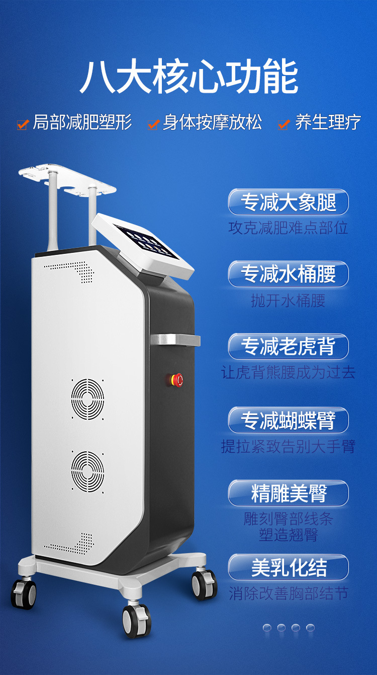 不同部位不同模式:8个部位塑形,理疗,美胸一台即可搞定,中低频混合技术更好的将脂肪转化成二氧化碳和水,。