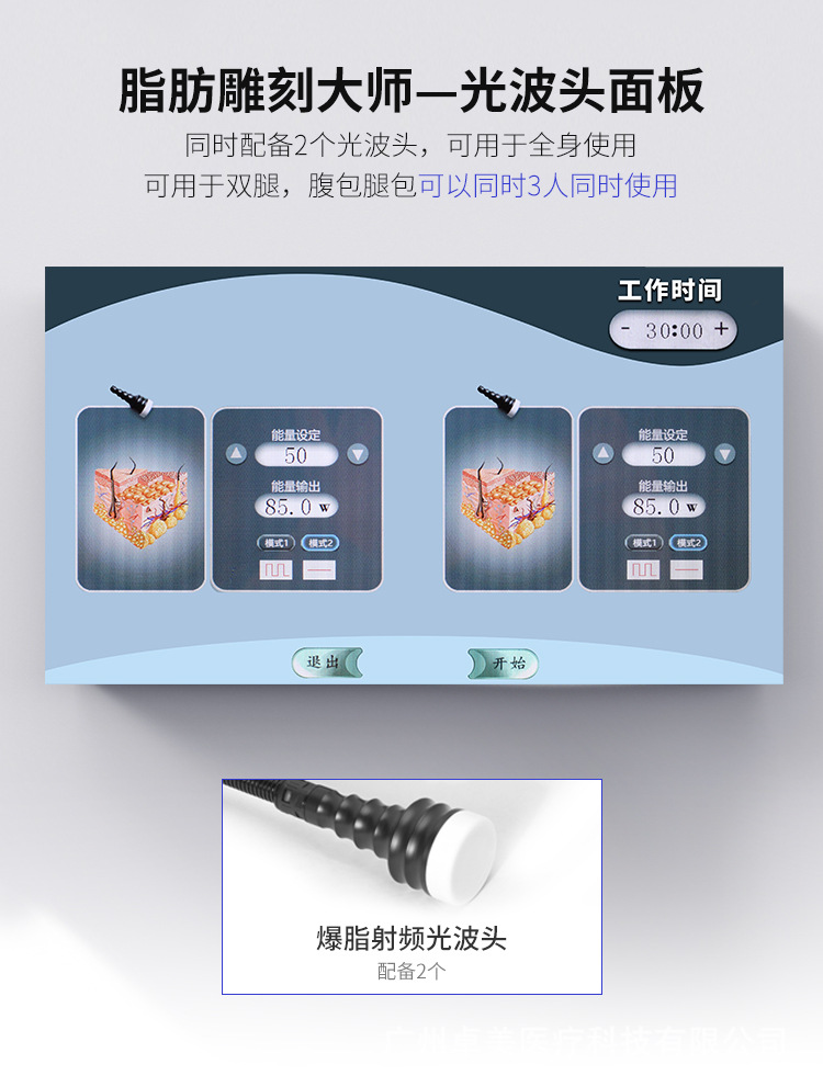 2个探头可同时使用:2个探头互不干涉,隔空射频爆脂技术,针对液体产生一种内爆效应,促使脂肪被迫运动,有效针对身体的每-寸脂肪,局部塑形,快速消脂。