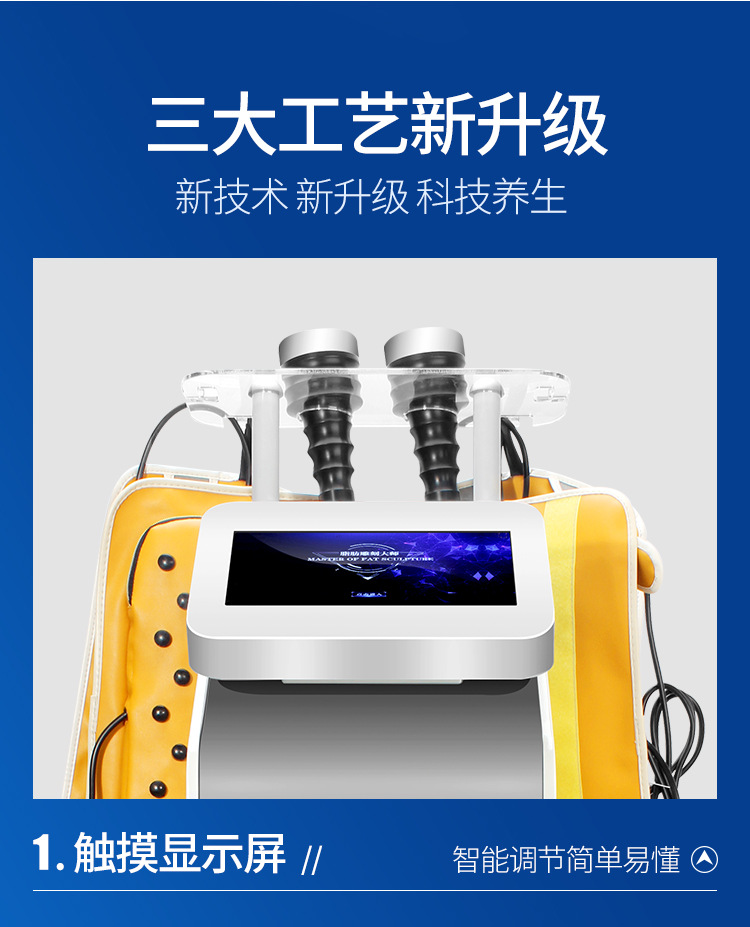 触摸显示屏:智能调节简单易懂,强声波针对液体产生种内爆效应,促使脂肪被迫运动,有效针对身体的每一寸脂肪。