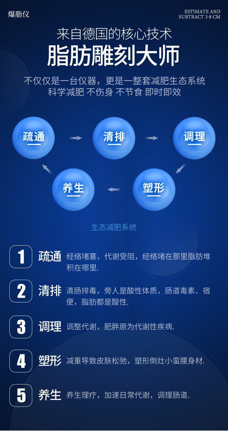 隔空爆脂仪采用德国的纳米隔空爆脂技术渗透6~12公分直接达到皮下脂肪,划好区域一定点溶脂一定点疏通,效果当初见效,操作30分钟立减3-8公分减重1-3斤(因人而异)三餐无需管理饮食,不用再受节食的约束。