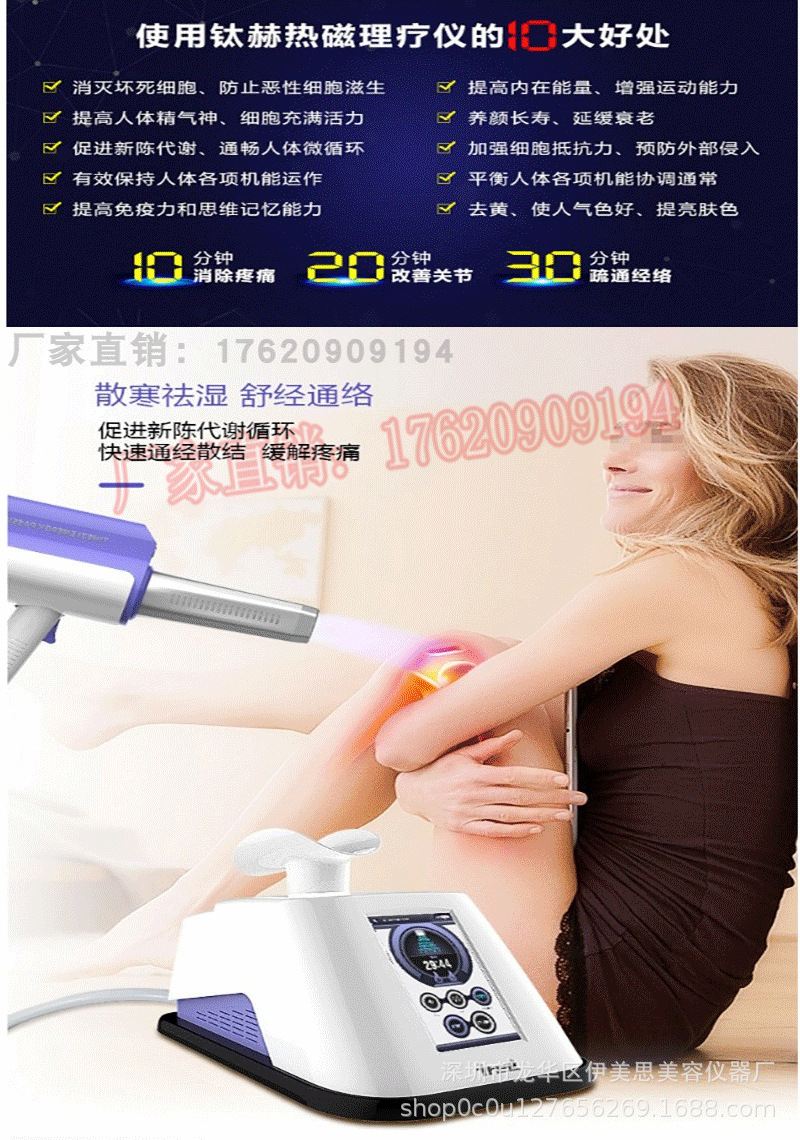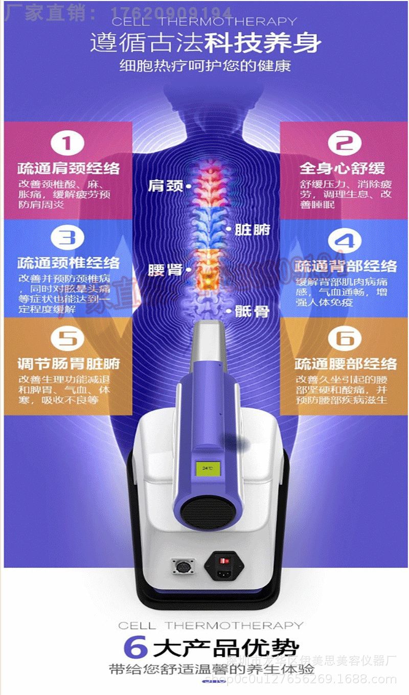 这款仪器的特点是针对关节,几乎人体所有关节处都能够操作,可有效缓解关节炎等状态。而且它可手持,方便携带等优势,支持出门旅行、家庭、美容养生机构等环境。