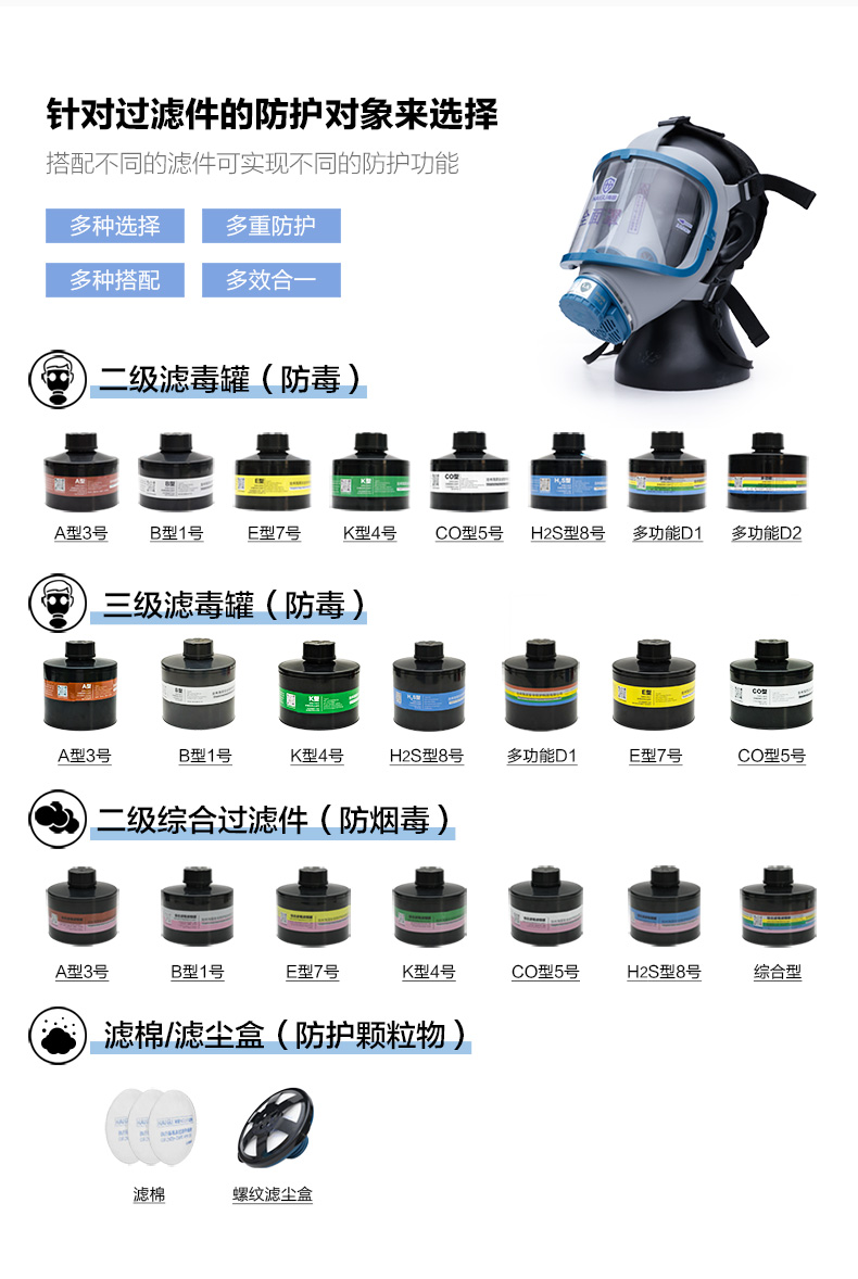 防毒面具、正压式空气呼吸器、长管呼吸器、过滤件、防化服、气体检测仪、高压呼吸空气压缩机