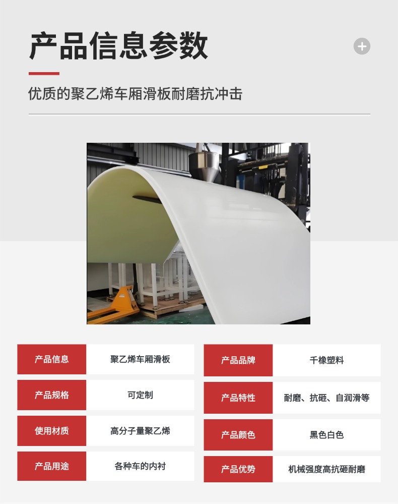 pe车厢滑板由(UHMW-PE)制成,主要用于货车、卡车等运输车辆的车厢内衬,减少货物与车厢的摩擦,便于装卸,同时保护车厢和货物。