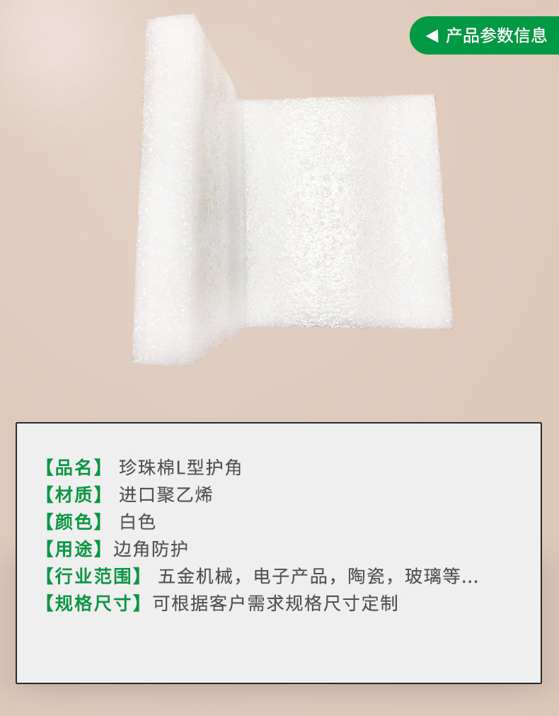合肥泽霖包装科技有限公司是EPE珍珠棉护角、珍珠棉定制包装、家具护角、相框护角、L型护角等产品生产加工的公司,拥有完整、科学的质量管理体系。合肥泽霖包装科技有限公司的诚信、实力和产品质量获得业界的认可。欢迎各界朋友莅临参观、指导和业务洽谈。