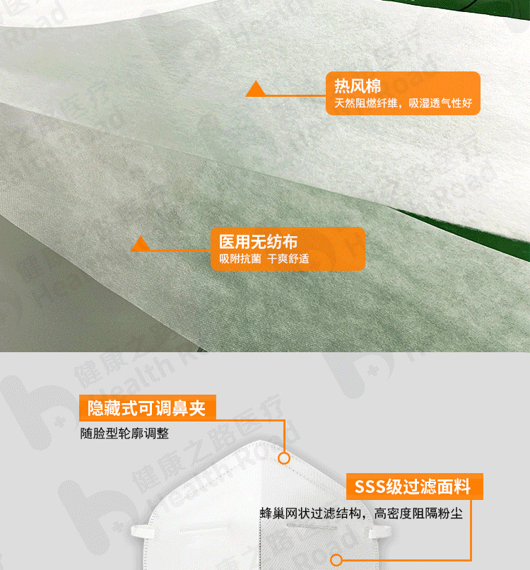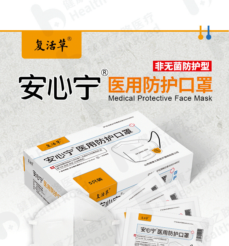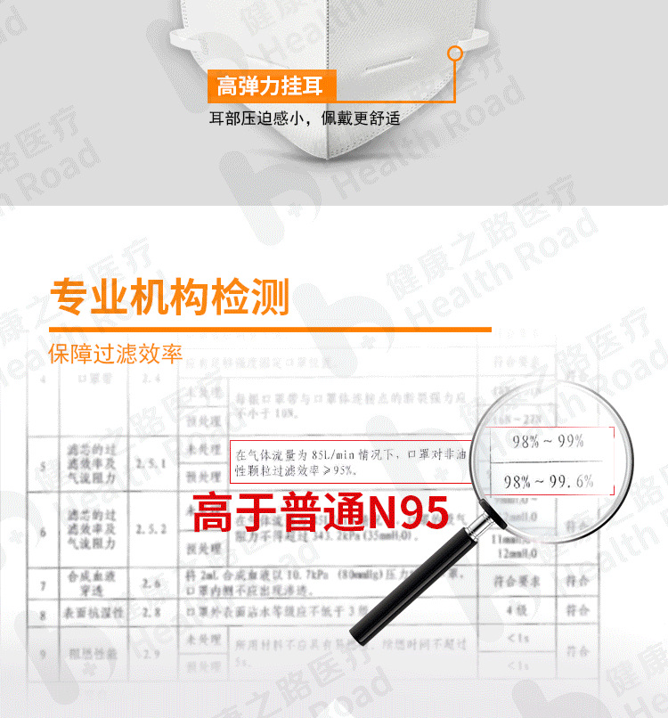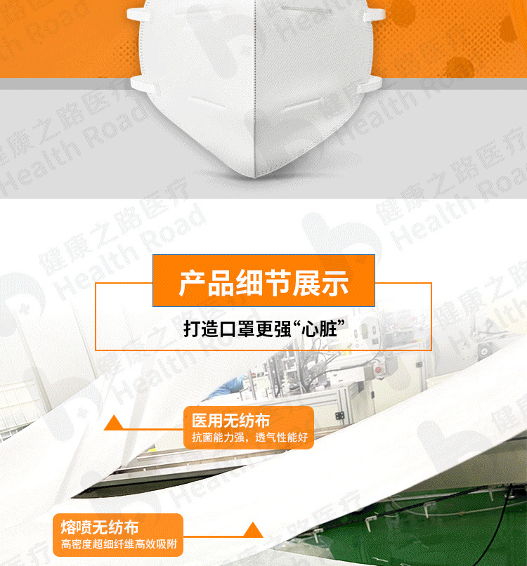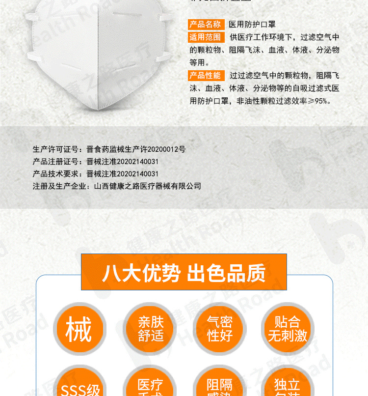 产品性能:过滤空气中的颗粒物,阻隔飞沫、血液、体液、分泌物等的自吸过滤式医用防护口罩,非油性颗粒过滤效率≥95%。