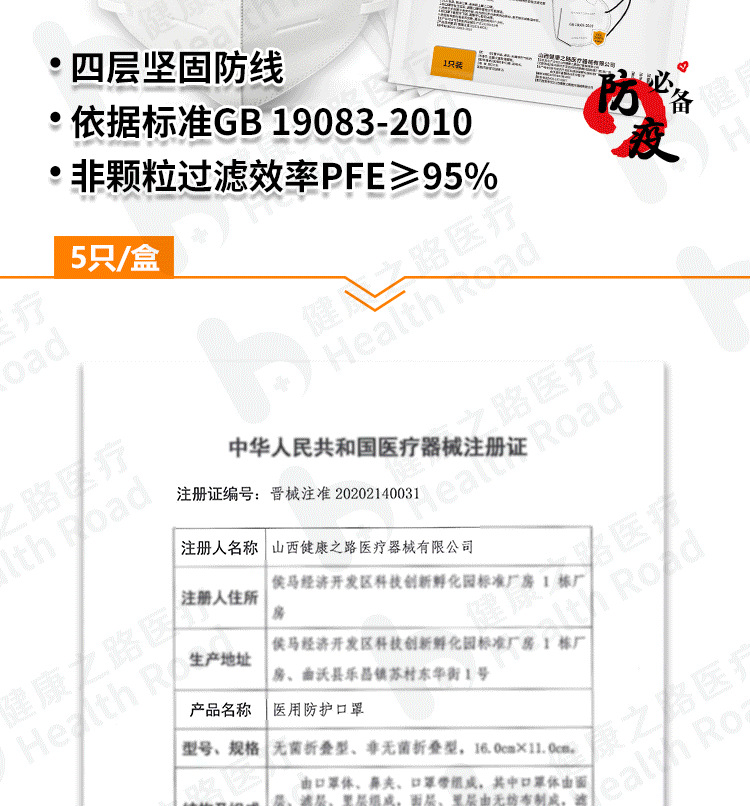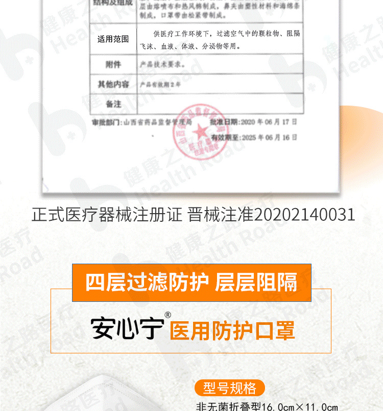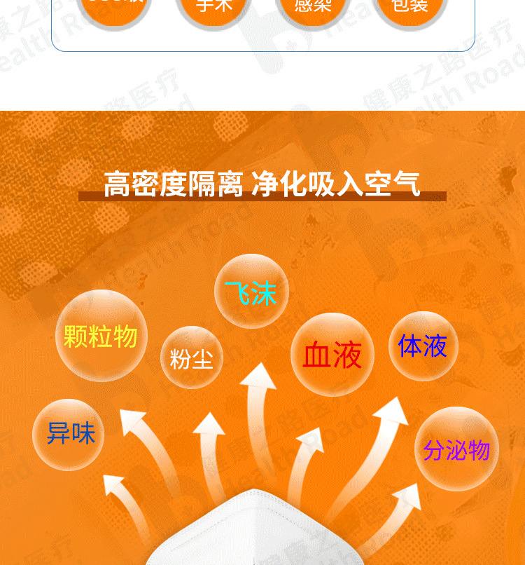 适用范围:供医疗工作环境下,过滤空气中的颗粒物、阻隔飞沫、血液、体液、分泌物等用。