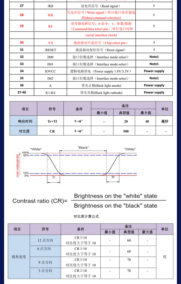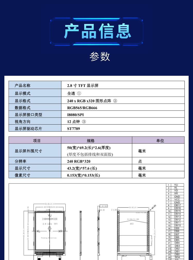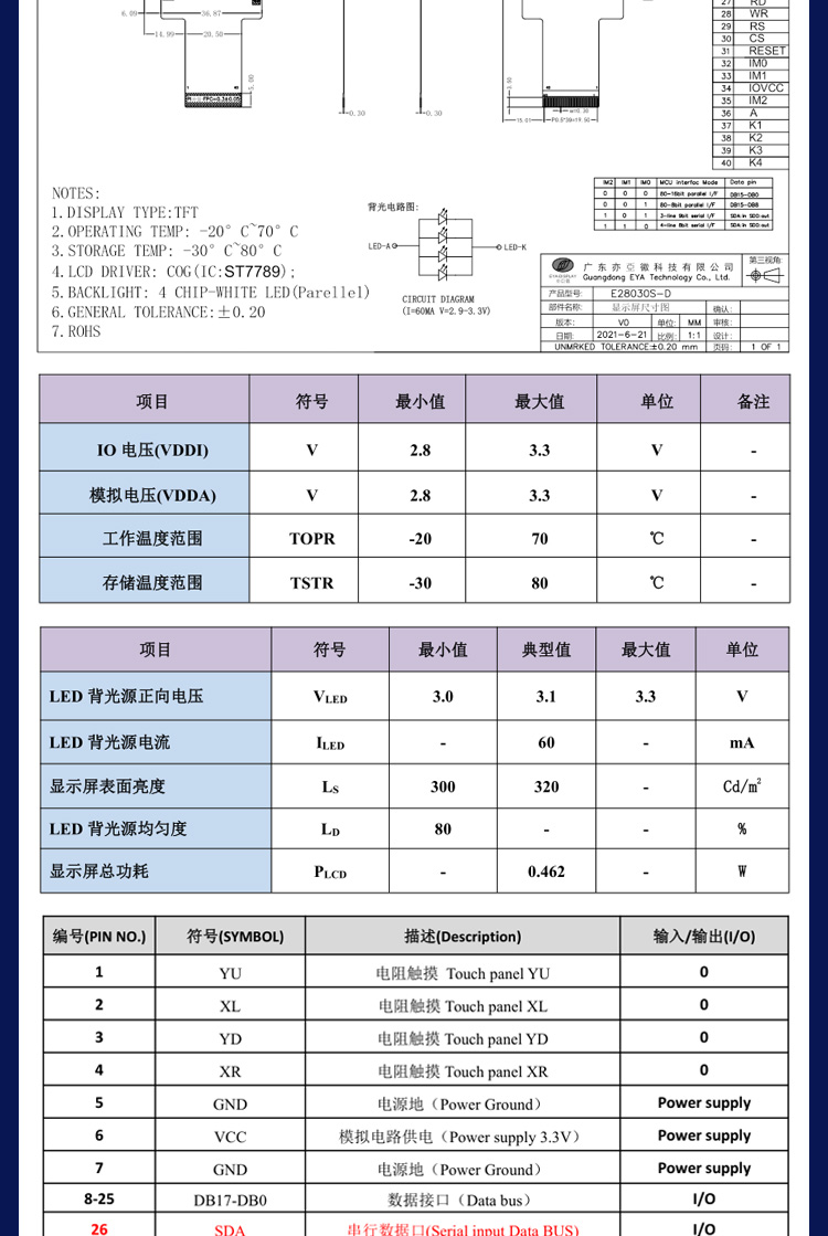 E28030S是一款2.8寸的TFT液晶屏,我是一款标准插接40Pin,间距为0.5mm的工控设备显示屏,分辨率是240*RGB*320,我的接口类型兼容了8位并口/16位并口/3线SPI/4线SPI。是一款12点钟的TN型液晶屏。我有不带触摸和带电阻触摸两种形态,并且我这种标准接口还涵盖了多种尺寸,需要我的更多信息请联系我的主人亦亚徽哦。