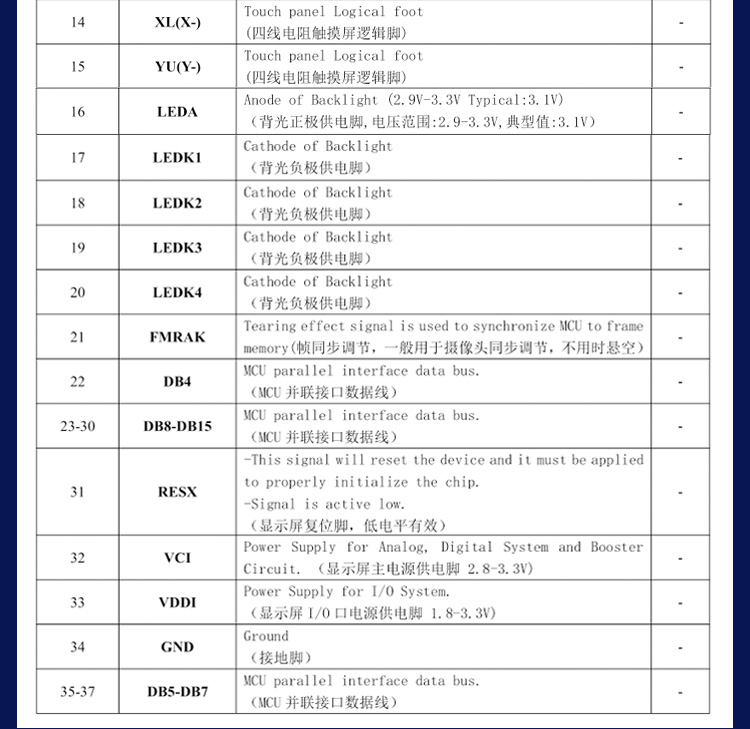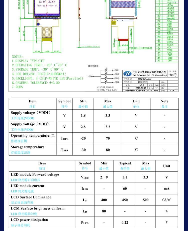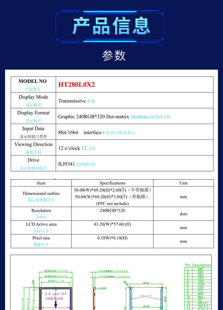 HT280L0X2是一款2.8寸的TFT液晶屏,主要应用于工控、手持设备、检测仪表、智能家居等行业。我是一款标准插接37Pin,间距为0.5mm的工控显示屏,我的接口类型有8位并口/16位并口可以选择,我的分辨率是240*RGB*320,是一款12点钟的TN型液晶屏。我有不带触摸和带电阻触摸以及带电容触摸三种形态,我的显示屏驱动芯片是ILI9341,并且我这种标准接口还涵盖了多种尺寸,需要我的更多信息请联系我的主人亦亚徽哦。