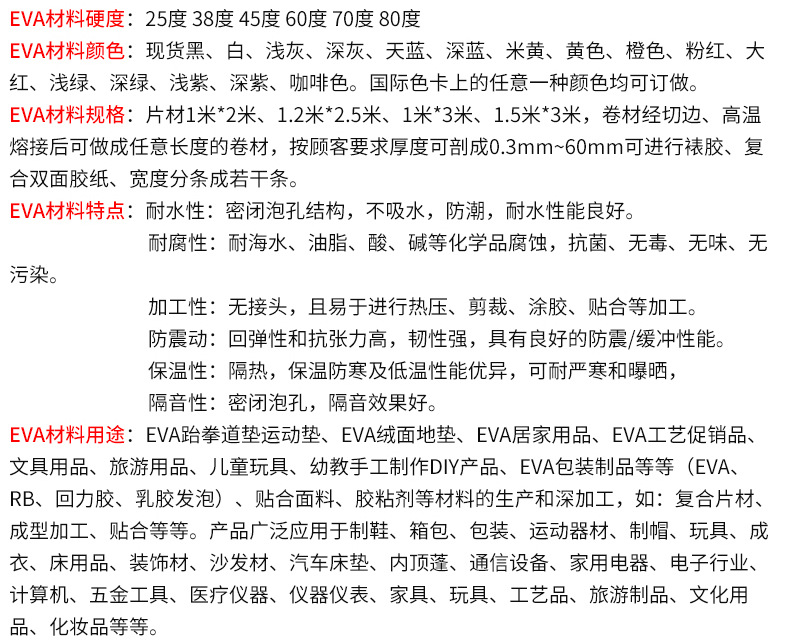 深圳东泰海绵生产加工各种EVA制品 EVA具有良好的缓冲、抗震、隔热、防潮、抗化学腐蚀等优点,且无毒、不吸水,经设计可加工成形,其防震性能优于聚苯乙烯(泡沫)等传统发泡材料且符合环保要求,是出口产品的选择。