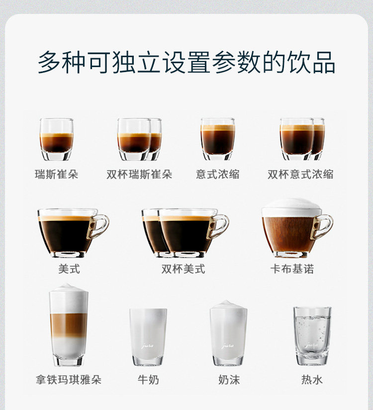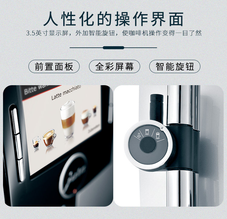 可调节高度的清咖出口:65-111mm 宽度可调的清咖出口 20-50 mm机身尺寸:28*32.2*43.3cm 一键式制作多种牛奶咖啡,屏幕显示 TFT中文彩色显示脉冲萃取技术智能预润醇香系统智能水系统优瑞奶沫器节能模式约25块加大粉渣盒加大的粉渣盒减少了清理底盘的次数可从正面取放的3L大水箱既节省了空间,又减少了加水的时间带密封盖的500克大豆槽大容量的豆槽减少了加豆的次数磨豆机 Arioma G3真空清洁冲煮器特色饮品数量滤芯 可瑞丝商用智能滤芯可预设咖啡浓度 8级可预设热水温度 3级豆粉两用且可手动调节牛奶奶沫的比例豆粉两用,既能使用咖啡豆也能使用咖啡粉