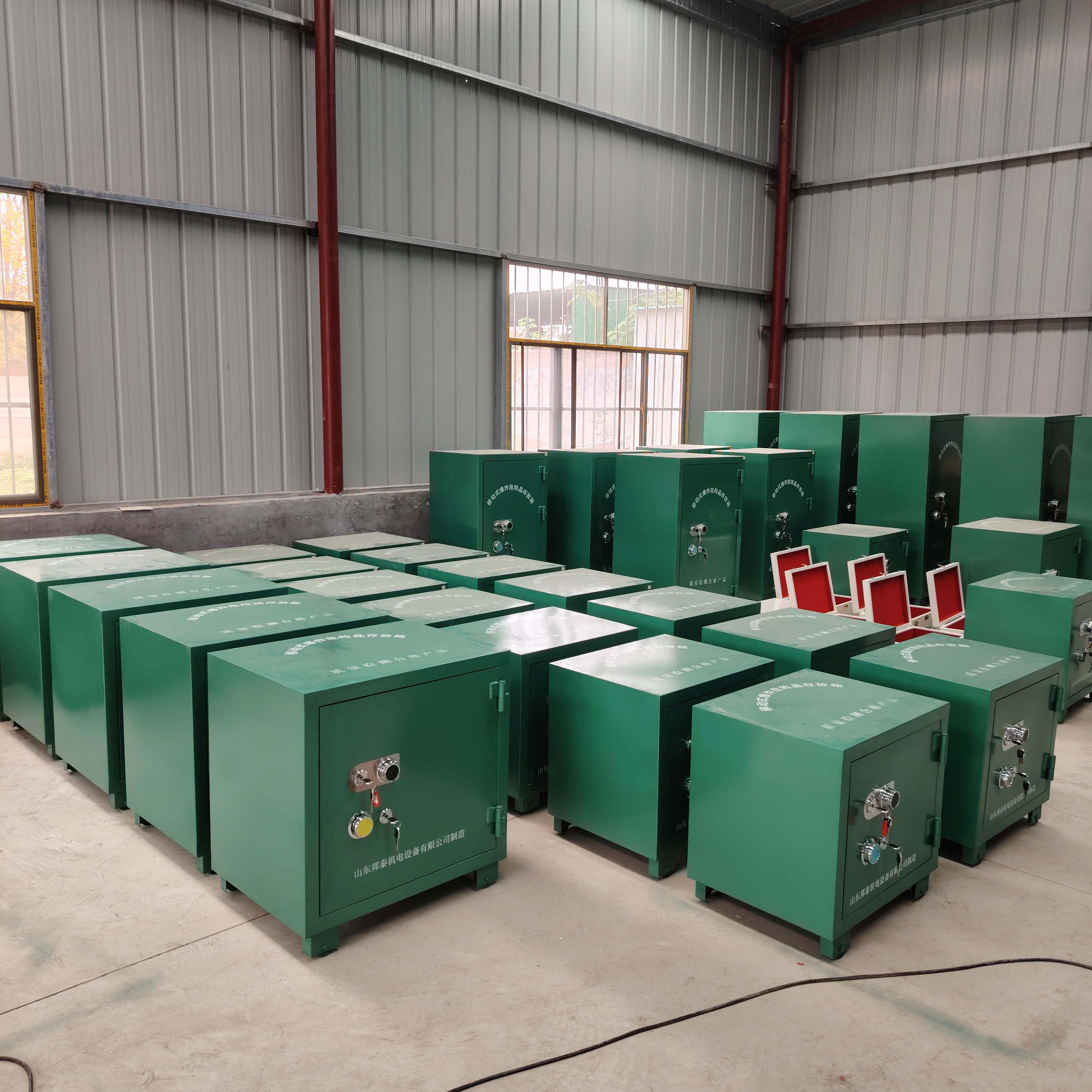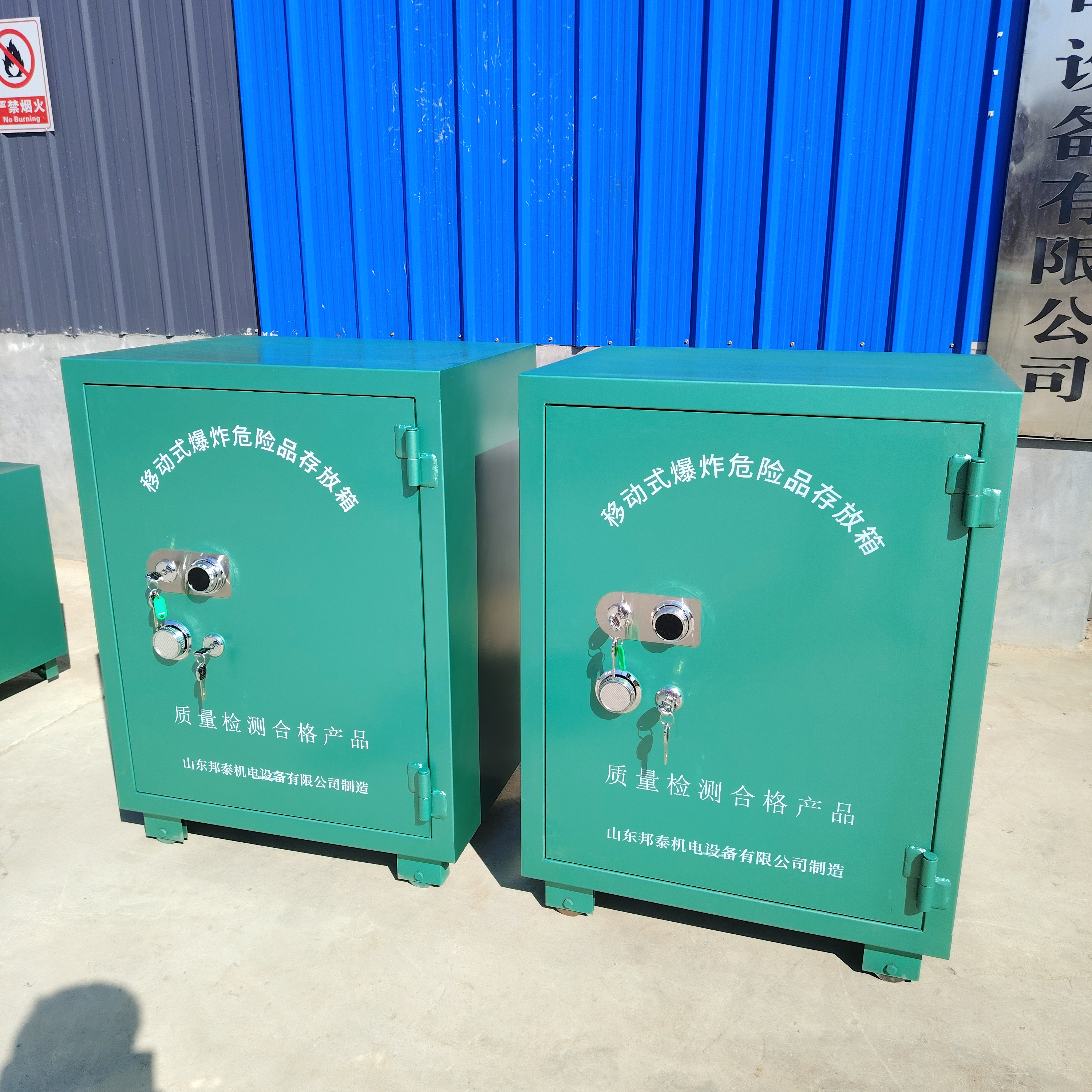 存储柜外体是采用6mm防爆钢板,内置10mm绝木板,内部铺设抗震防静电阻燃毡。因移动火工品柜是放置在室外露天使用,为增强其防盗作用,柜体的锁具采用的是GA机械双锁,即两把机械锁和一把三位密码机械转盘锁。其中,爆破员保管1号钥匙和密码,库管员或安全员保管2号钥匙,共同打开后,才能领取