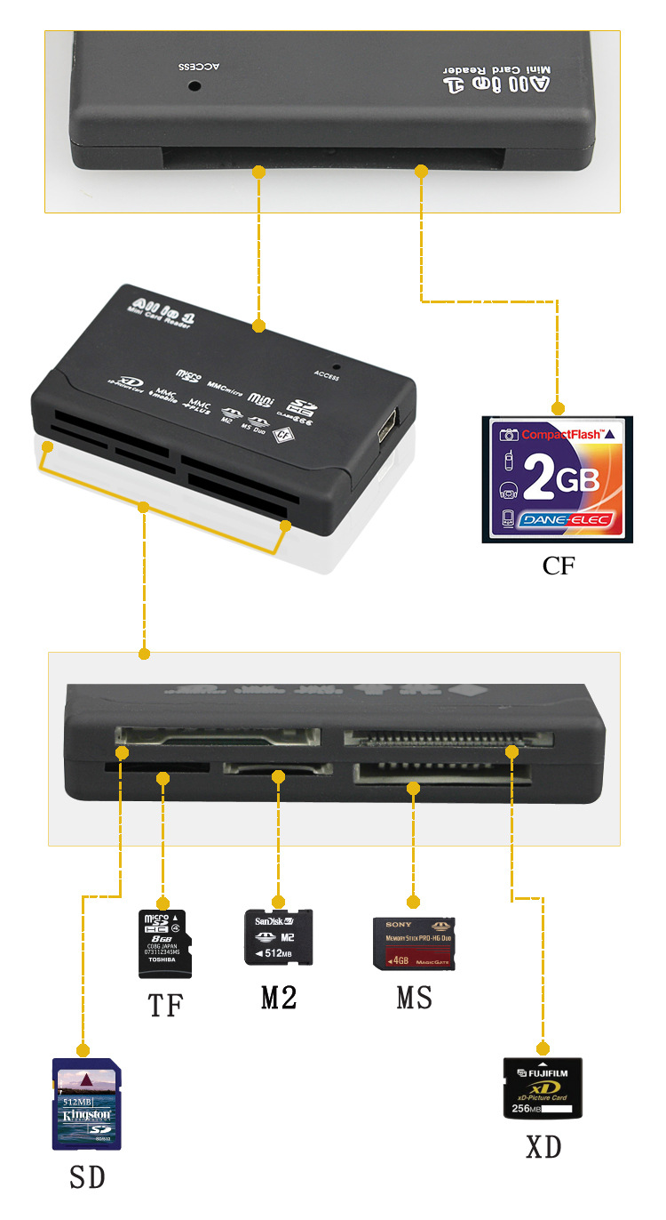 | 接口 | USB 2.0 | 支持存储卡 | MicroSD,MMC Plus,Mini SDHC,mmc,MS Duo,RS-MMC,CF,MS micro(M2),ms pro duo,SDHC,SD,TF,MS PRO,MMCmobile | 安装方式 | 外置 |