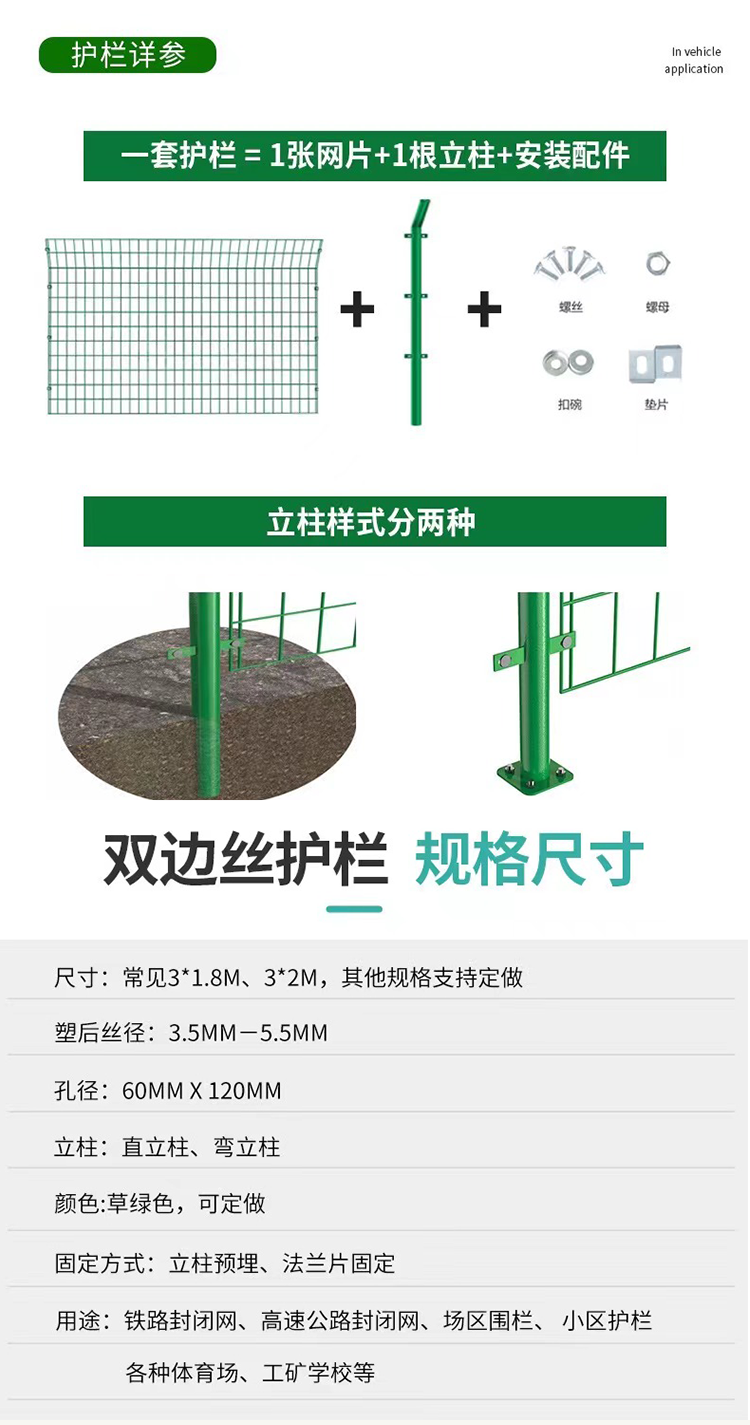 车间护栏网;*用于高速公路和、铁路、桥梁两侧的防护带;机场、港口、码头的安全防护;市政建设中的公园、草坪、动物园、池湖、道路、及住宅区的隔离与防护;宾馆、酒店、超市、所的防护与装饰。