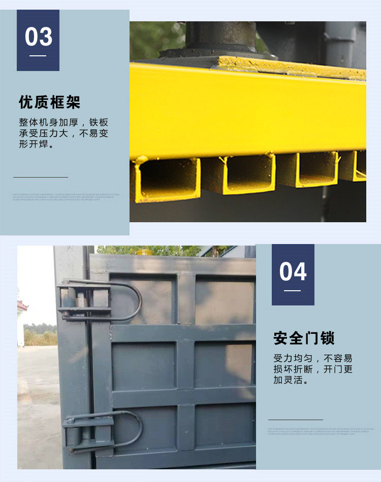 本产品具有良好的刚韧性和稳定性,造型美观大方,操作维修方便,安全节能,设备基础工程投资费用低等特点。它广泛应用于各类废纸厂、旧物回收公司等单位企业,适用于对旧物废纸、塑料秸秆等的打包回收,是提高劳动效率、减少劳动强度、节约人力、减少运输费用的好设备。