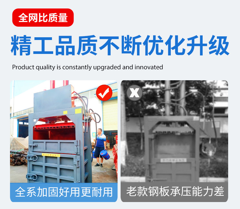 本产品具有良好的刚韧性和稳定性,造型美观大方,操作维修方便,安全节能,设备基础工程投资费用低等特点。它广泛应用于各类废纸厂、旧物回收公司等单位企业,适用于对旧物废纸、塑料秸秆等的打包回收,是提高劳动效率、减少劳动强度、节约人力、减少运输费用的好设备。