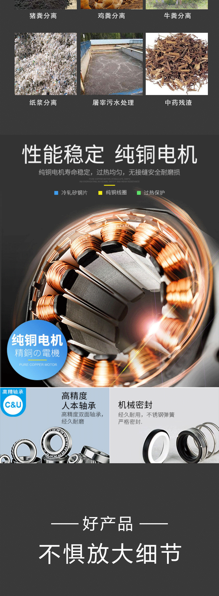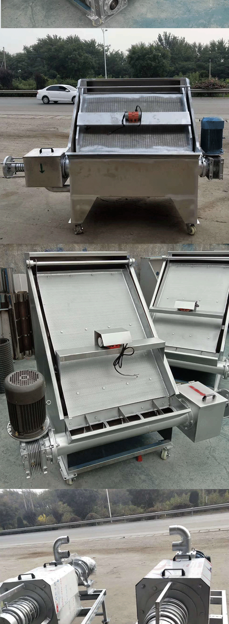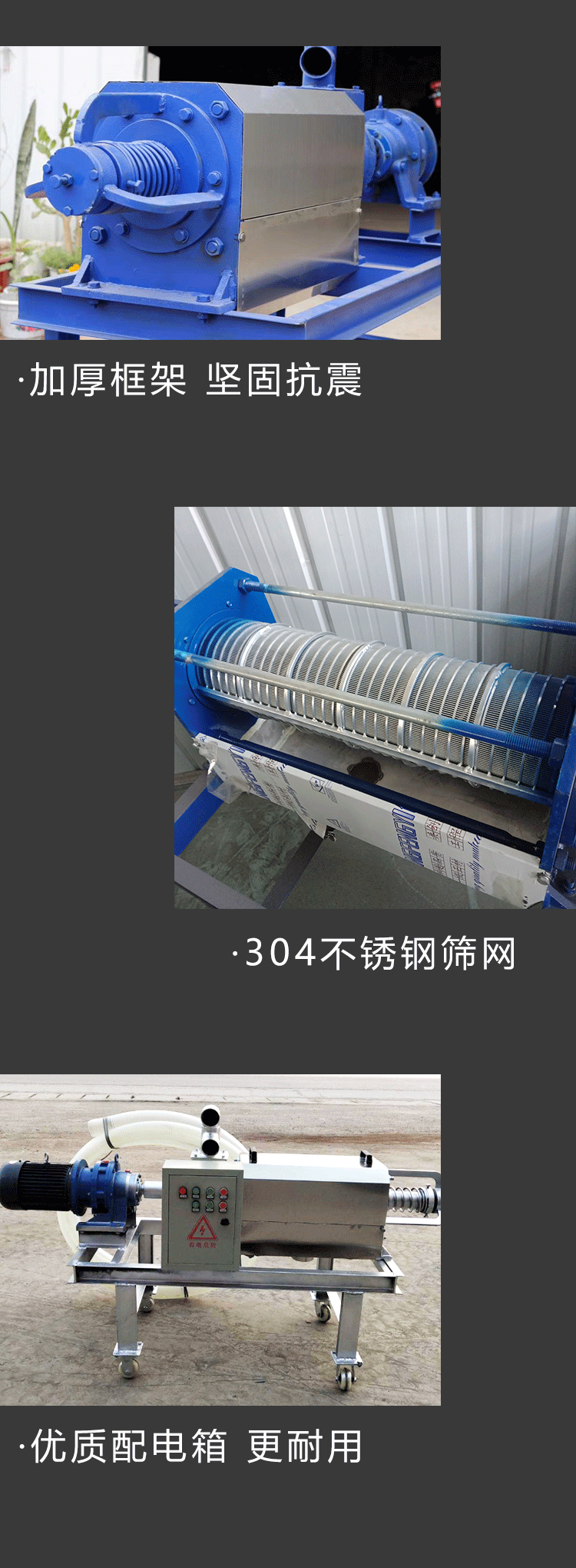 固液分离机利用电机驱动,通过减速机带动驱动轴,利用螺旋绞龙叶片转动,产生挤压动作,将大量含水份的物料、动物粪便中的水分通过滤网挤出,从而使物料、粪便中的固体和液体分离,达到“固”“液”分离的效果。