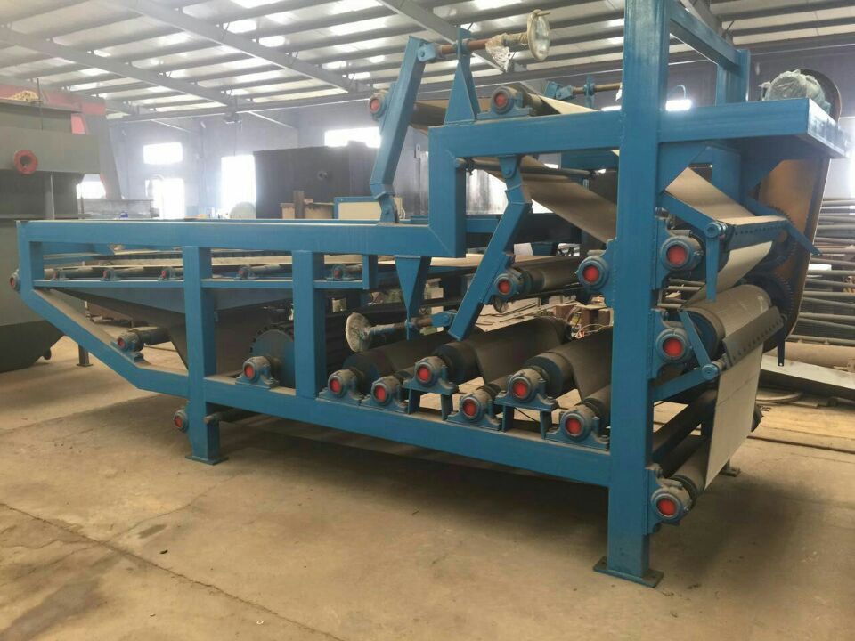 含水污泥,经污泥泵输送至污泥搅拌罐,同时投加凝聚剂进行充分混合反应,而后流 入带式污泥压布泥器,污泥均匀分布到重力脱水区上,并在泥耙的双向疏导和重力作用下,污泥随着脱水滤带的移动,迅速脱去污泥的游离水。由于重力脱水区设计长,从而达到重力脱水。翻转下来的污泥进入超长的楔形预压脱水区将重力区卸下的污泥缓缓夹住,形成三明治式的夹角层,对其进行顺序缓慢预增加压过滤,使泥层中的残余游离水份减低,随着上下两条滤带缓慢前进,两条滤带之间的上下距离逐渐减小,中间的泥层逐渐变硬,通过预压脱水大直径的过滤辊,,将大量的游离水脱掉,为泥饼 污泥压滤机顺利进入挤压脱水区,进入“ S ”压榨段,在“ S ”型压榨段中,污泥被夹在上、下两层滤布中间,经若干个压榨辊反复压榨,上下两条滤带在经过交错各辊形成的波形路径时, 由于两条滤带的上下位置顺序交替,对夹持的泥饼产生剪切力, 将残存于污泥中的水分绝大部分积压滤除,促使泥饼再一次脱水,后通过刮刀将干泥饼刮落,由皮带输送机或无轴螺旋输送机运至污泥存放处。