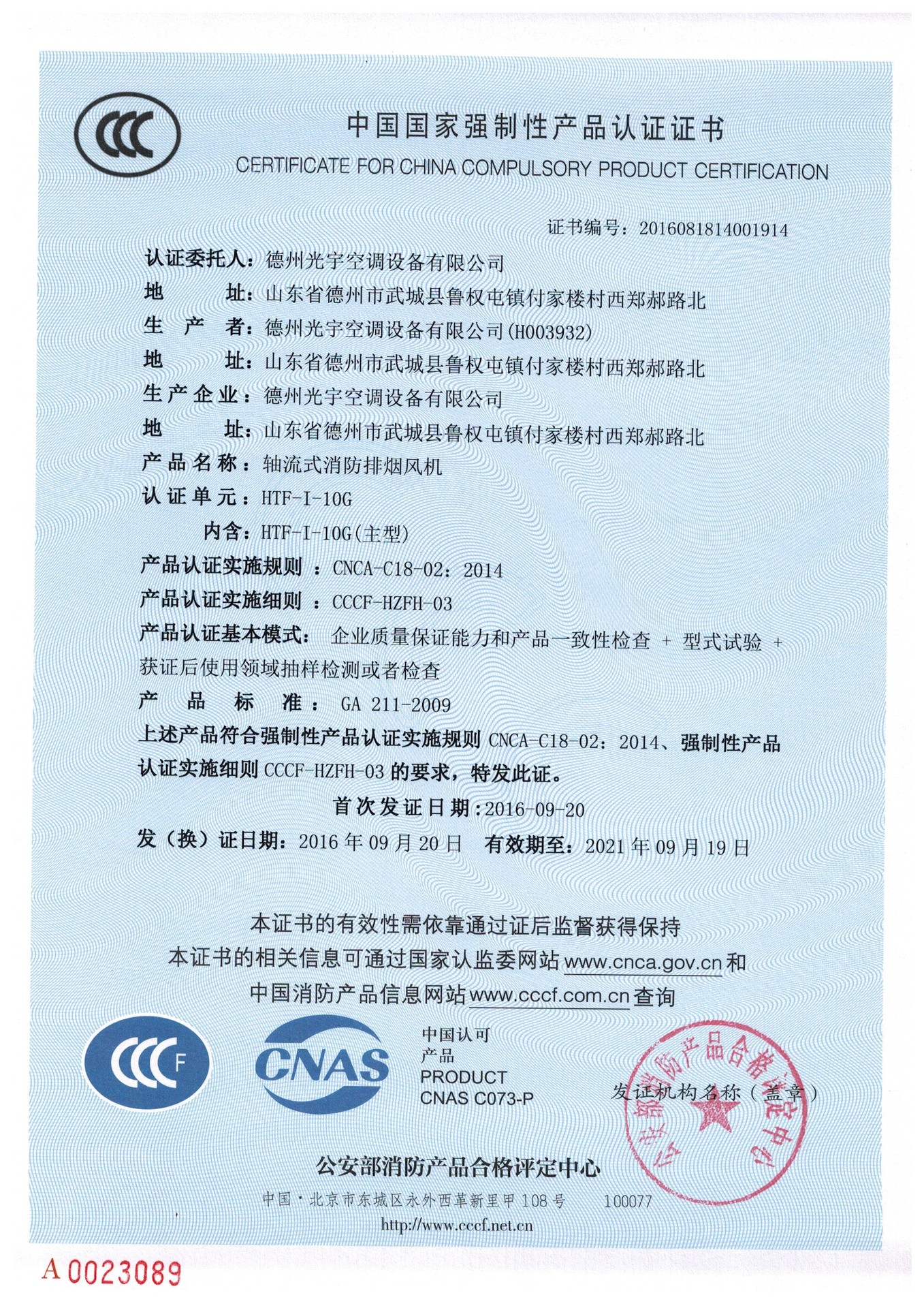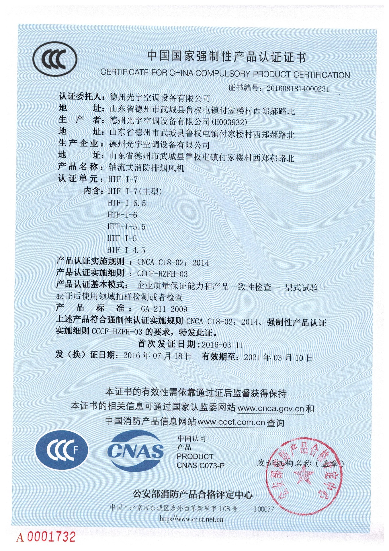 我公司已取得CCC中国国家强制性产品认证证书 HTF型消防高温排烟专用风机,具有性能优良、耐高温性能良好、效率高、占地比离心风机少、安装方便等特点。广泛应用于高级民用建筑、烘箱、地下车库、隧道等场合。该风机基本形式为轴流式风机或斜流式风机,可直接与风管连接或墙壁安装,安装形式可采用垂直式或水平式。如对风量、全压、安装尺寸等性能有特殊要求时,我公司将为您另行设计生产。欢迎广大客户朋友来公司考察指导工作。