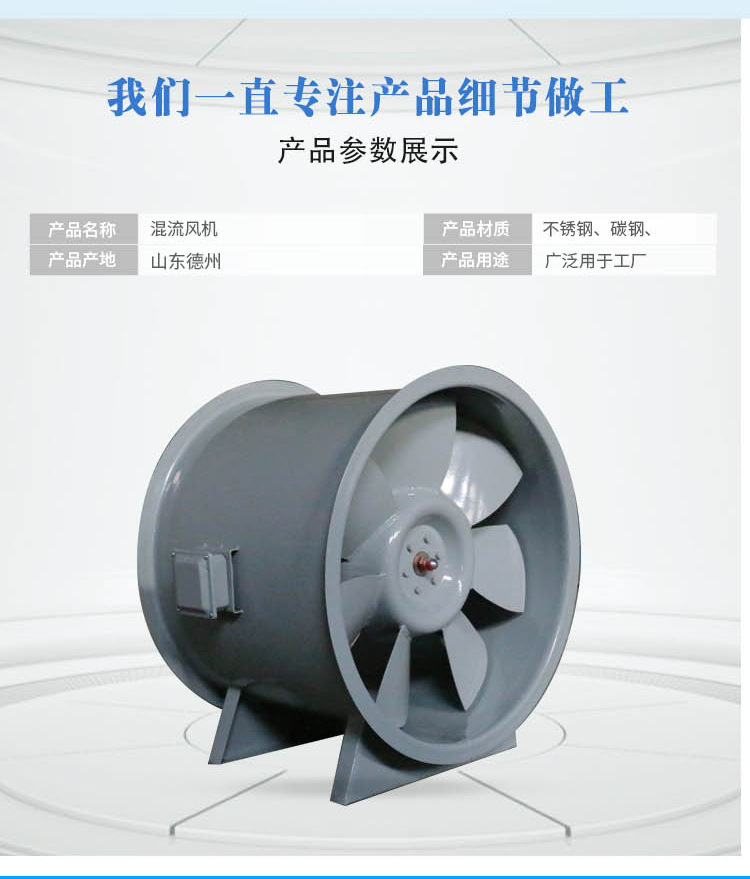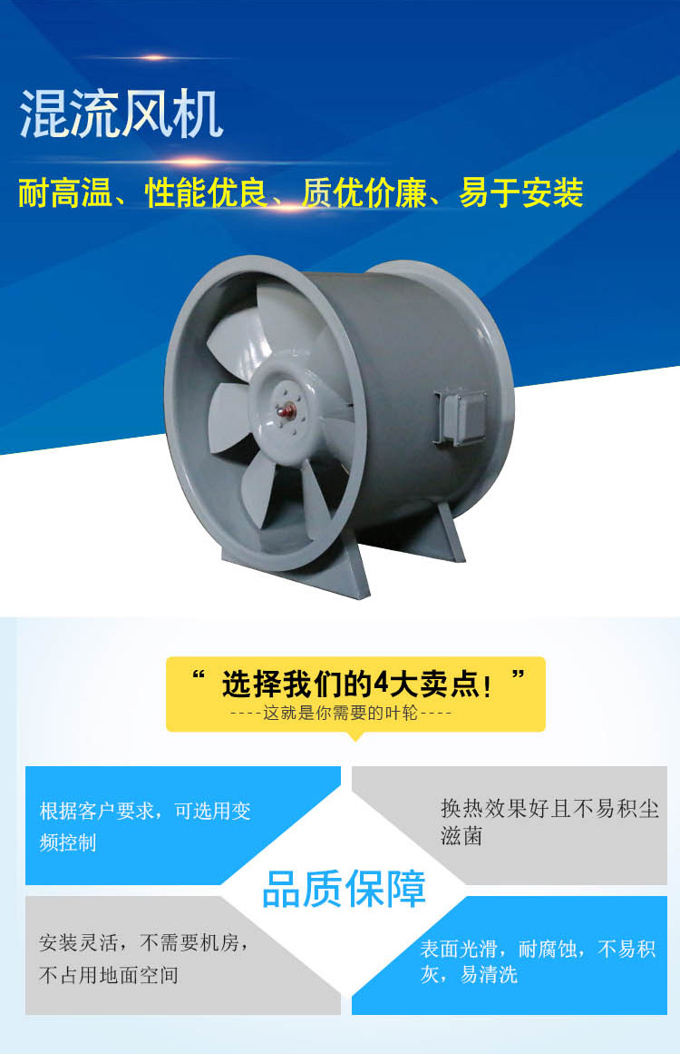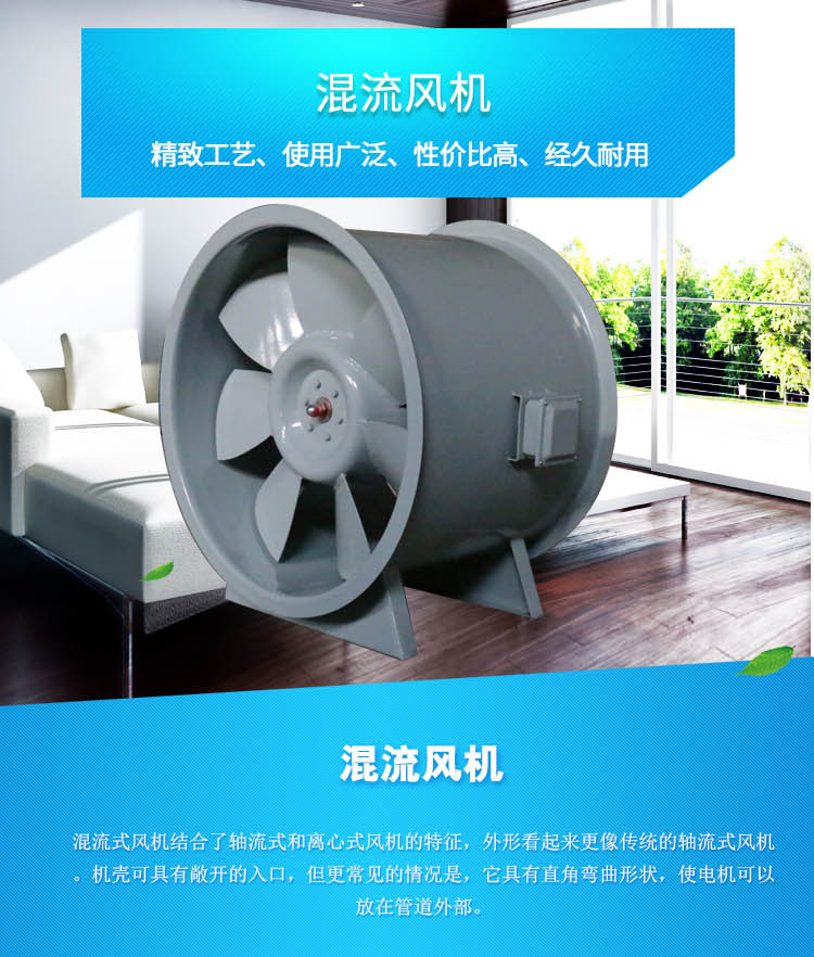混流(斜流)风机,风压系数比轴流风机高,流量系数比离心风机大,用在风压和流量都"不大不小"的场合。它填补了轴流风机和离心风机之间的空白。同时具备安装简单方便的特点。
