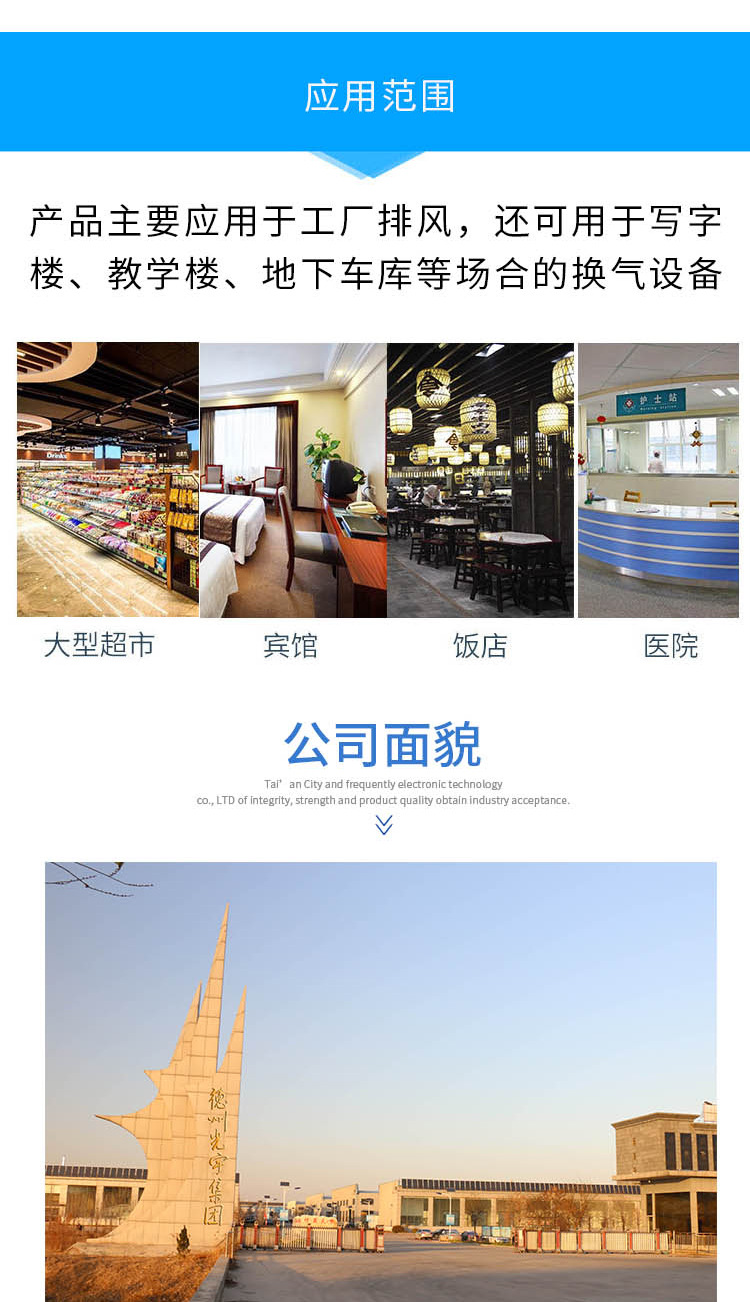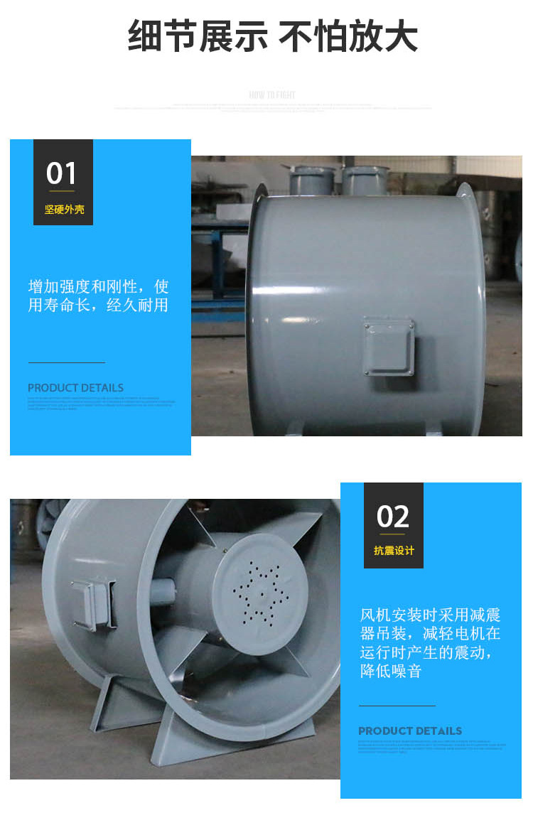 风机主要有叶轮、机壳、进口集流器、导流片、电动机等部件组成。叶轮采用有子午加速特点的扭曲平板焊接在轮毂上。经动平衡校验,超速试验,有良好的空气动力性能。机壳采用圆形,与消音功能的集风器联接成整体。出口装有导流片,具有良好的气流分布,压力稳定。