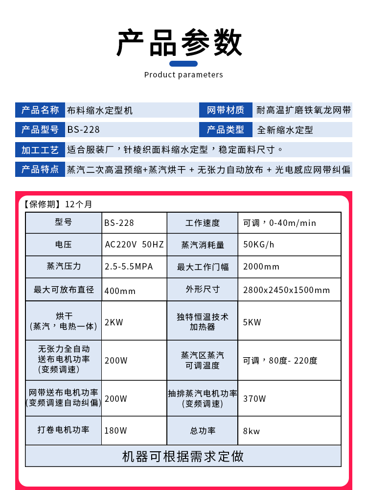 布料预缩定型机主要参数: