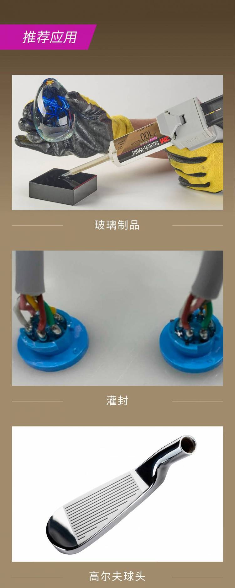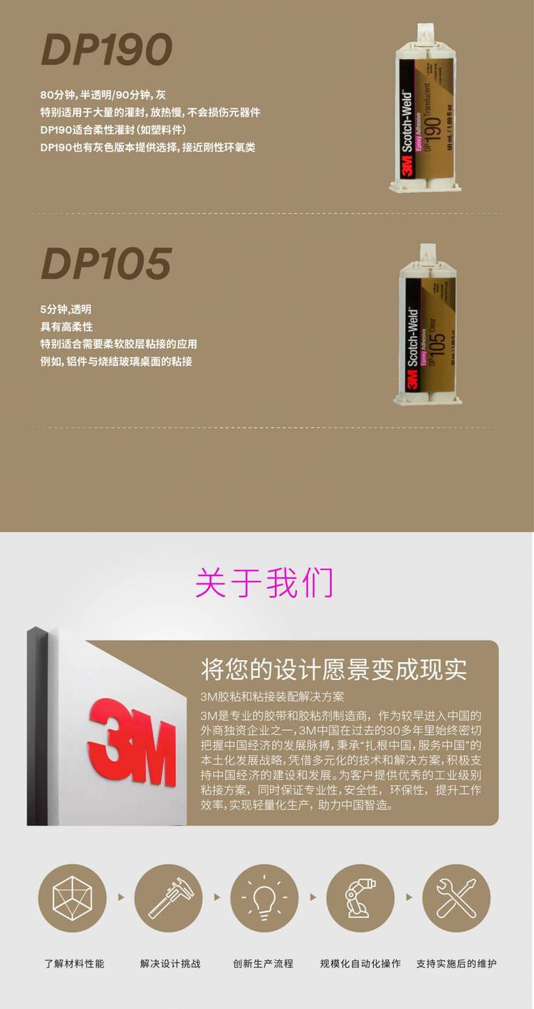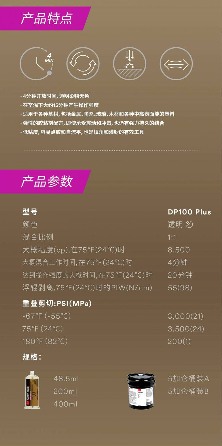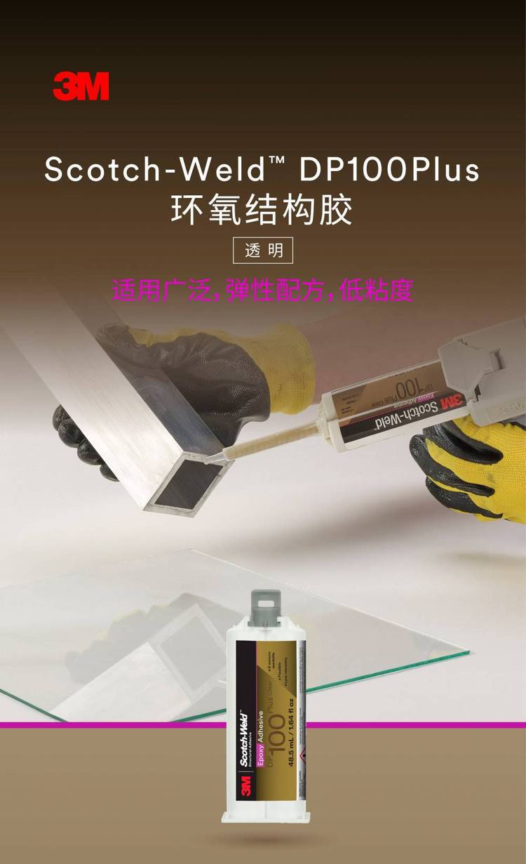 3M DP100是3M非常常见的双组分透明的环氧胶水,AB组分1:1混合,操作时间5分钟,达到操作强度时间20分钟,终固化24小时。可以用于粘接部分塑料、金属、玻璃、木材等多种材料,在很多场合被用于取代螺丝、铆钉和焊接。性能非常。 |