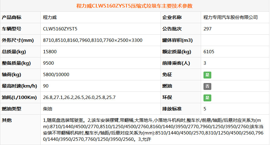 东风专底10方压缩式垃圾车上装配置:程力威牌CLW5160ZYST5型压缩式垃圾车 产品主要技术资料 产品名称:CLW5160ZYST5型压缩式垃圾车外型尺寸(mm):8710,8510,8160,7960×2500×3300(mm) 产品型号:CLW5160ZYST5批次:281 底盘型号:EQ1160GD5DJ货厢尺寸(mm):××(mm) 总 质 量 :(kg)15800(kg)接近/离去角(° )23/14,23/15(°) 额定质量:(kg)6105(kg)前悬/后悬(mm):1440/2770,1440/2570(mm) 整备质量:(kg)9500(kg)高车速(km/h):90(km/h) 轴荷:5800/10000