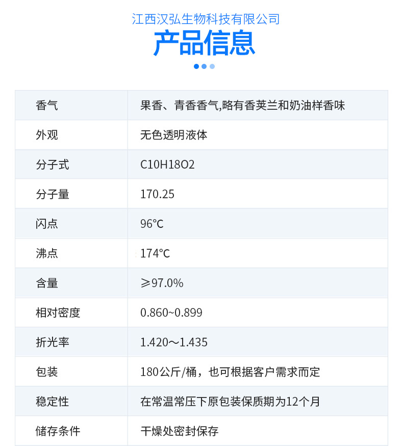 江西汉弘生物科技有限公司位于素有“江南望郡”之称的江西省吉安市,是集国内、国外贸易为一体的综合性公司,经销产品包含植物性天然香料、合成香料、医药中间体等百余品种。公司拥有完善的生产基地,高科技仪器设备,雄厚的技术力量和有经验的科研队伍,由长达二十余年从事香精香料技术开发的调香科研人员及管理人员组成,并和国内外多家先进的香精香料公司有着长久稳固的合作。汉弘生物一贯坚持“质量为先,信誉为重,管理为本,服务为诚”的经营理念,服务于广大企业客户朋友,发扬“团结、奋进、求实、创新”的精神,在国内外建立了完善的采销网络,为市场源源不断地输出高品质产品。欢迎各界朋友莅临参观、指导和业务洽谈。