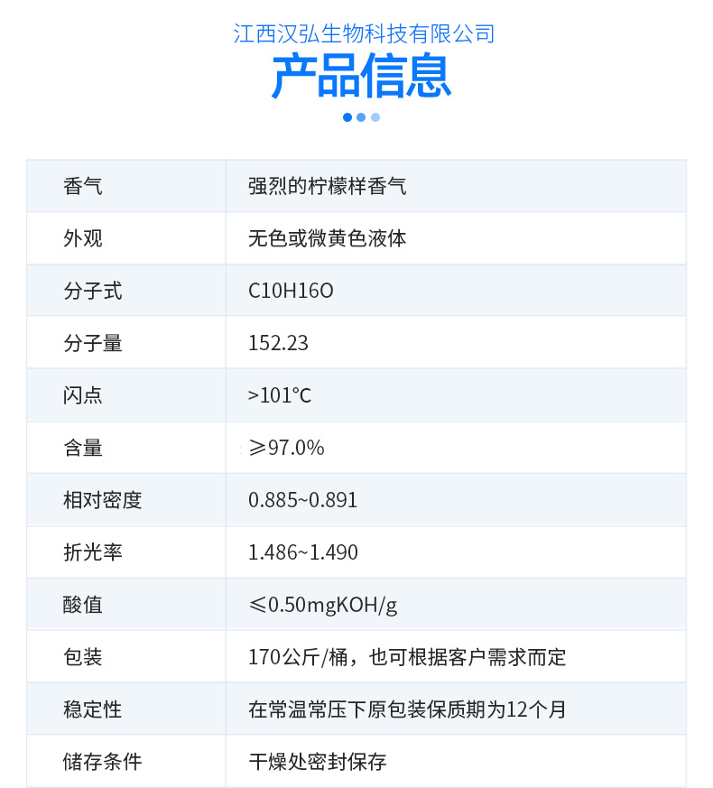 江西汉弘生物科技有限公司位于素有“江南望郡”之称的江西省吉安市,是集国内、国外贸易为一体的综合性公司,经销产品包含植物性天然香料、合成香料、医药中间体等百余品种。公司拥有完善的生产基地,高科技仪器设备,雄厚的技术力量和有经验的科研队伍,由长达二十余年从事香精香料技术开发的调香科研人员及管理人员组成,并和国内外多家先进的香精香料公司有着长久稳固的合作。汉弘生物一贯坚持“质量为先,信誉为重,管理为本,服务为诚”的经营理念,服务于广大企业客户朋友,发扬“团结、奋进、求实、创新”的精神,在国内外建立了完善的采销网络,为市场源源不断地输出高品质产品。欢迎各界朋友莅临参观、指导和业务洽谈。