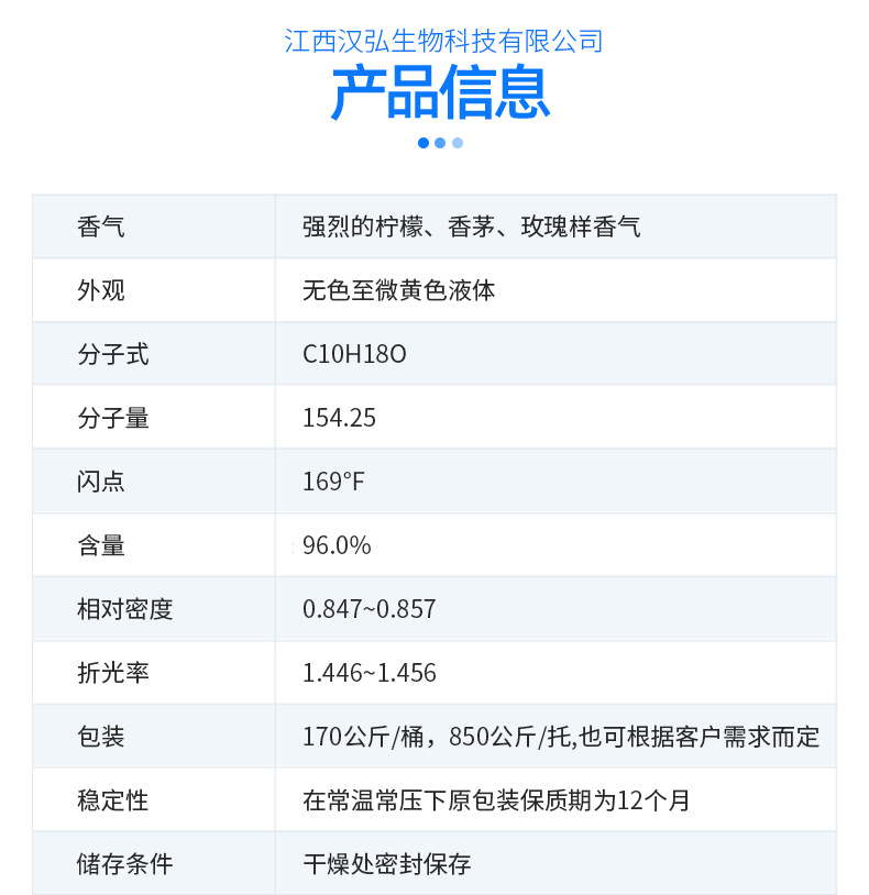 江西汉弘生物科技有限公司位于素有“江南望郡”之称的江西省吉安市,是集国内、国外贸易为一体的综合性公司,经销产品包含植物性天然香料、合成香料、医药中间体等百余品种。公司拥有完善的生产基地,高科技仪器设备,雄厚的技术力量和有经验的科研队伍,由长达二十余年从事香精香料技术开发的调香科研人员及管理人员组成,并和国内外多家先进的香精香料公司有着长久稳固的合作。汉弘生物一贯坚持“质量为先,信誉为重,管理为本,服务为诚”的经营理念,服务于广大企业客户朋友,发扬“团结、奋进、求实、创新”的精神,在国内外建立了完善的采销网络,为市场源源不断地输出高品质产品。欢迎各界朋友莅临参观、指导和业务洽谈。