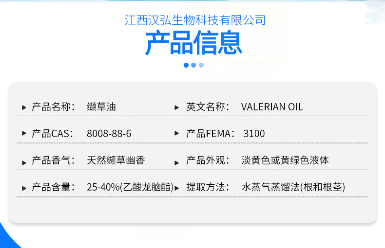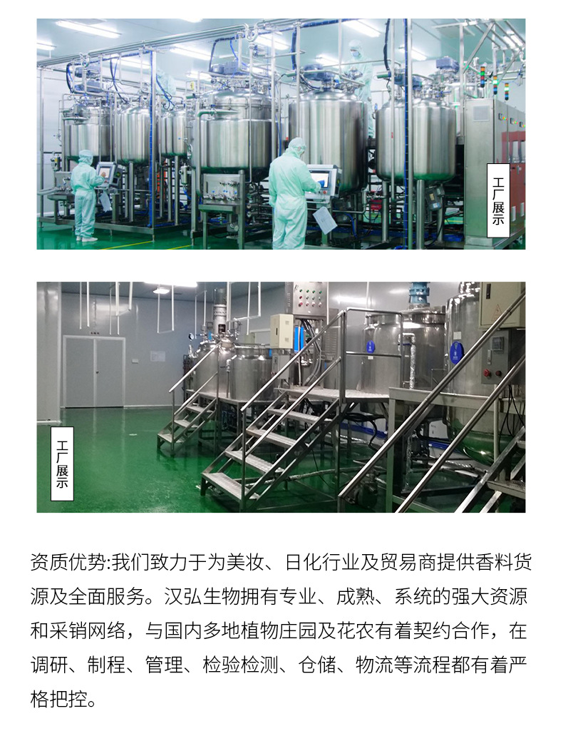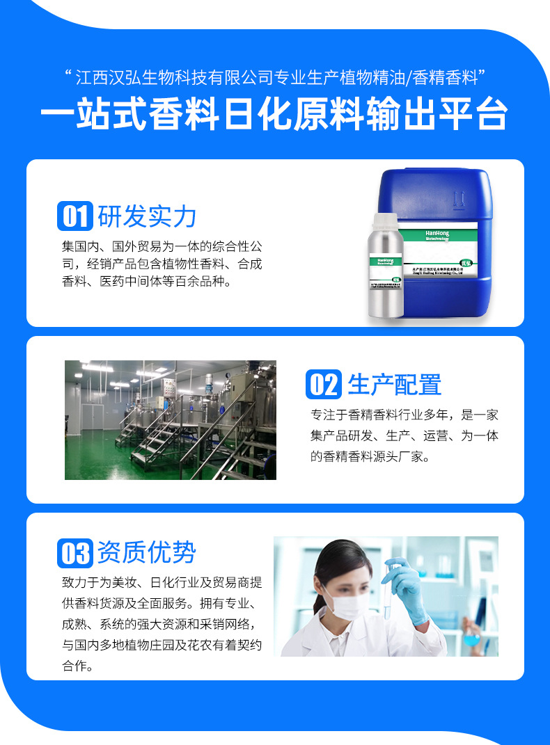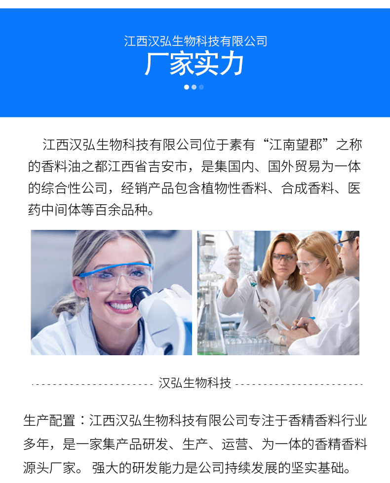 江西汉弘生物科技有限公司位于素有“江南望郡”之称的江西省吉安市,是集国内、国外贸易为一体的综合性公司,经销产品包含植物性天然香料、合成香料、医药中间体等百余品种。公司拥有完善的生产基地,高科技仪器设备,雄厚的技术力量和有经验的科研队伍,由长达二十余年从事香精香料技术开发的调香科研人员及管理人员组成,并和国内外多家先进的香精香料公司有着长久稳固的合作。汉弘生物一贯坚持“质量为先,信誉为重,管理为本,服务为诚”的经营理念,服务于广大企业客户朋友,发扬“团结、奋进、求实、创新”的精神,在国内外建立了完善的采销网络,为市场源源不断地输出高品质产品。欢迎各界朋友莅临参观、指导和业务洽谈。