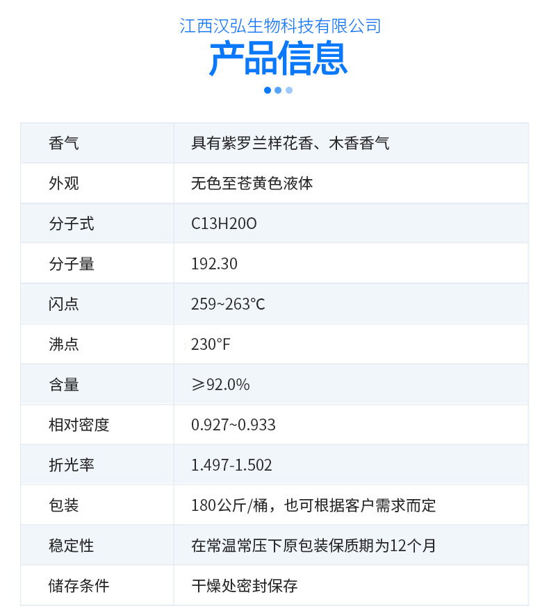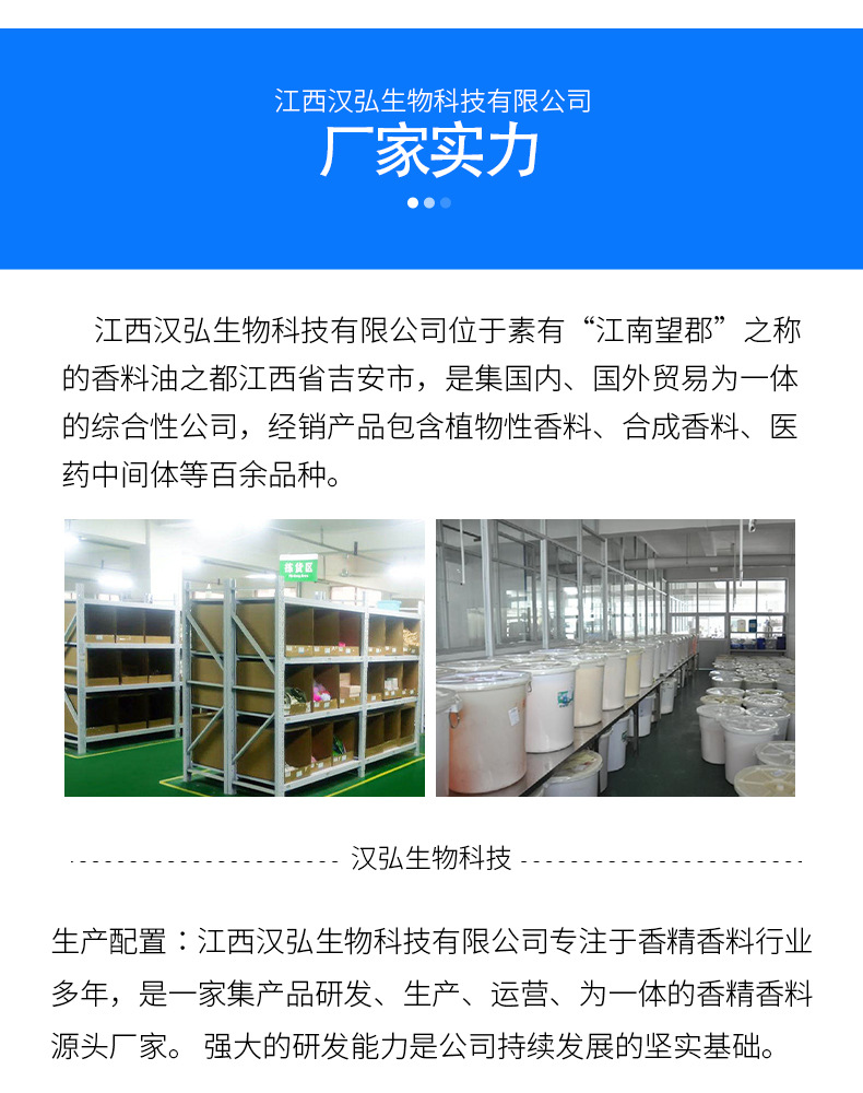 江西汉弘生物科技有限公司位于素有“江南望郡”之称的江西省吉安市,是集国内、国外贸易为一体的综合性公司,经销产品包含植物性天然香料、合成香料、医药中间体等百余品种。公司拥有完善的生产基地,高科技仪器设备,雄厚的技术力量和有经验的科研队伍,由长达二十余年从事香精香料技术开发的调香科研人员及管理人员组成,并和国内外多家先进的香精香料公司有着长久稳固的合作。汉弘生物一贯坚持“质量为先,信誉为重,管理为本,服务为诚”的经营理念,服务于广大企业客户朋友,发扬“团结、奋进、求实、创新”的精神,在国内外建立了完善的采销网络,为市场源源不断地输出高品质产品。欢迎各界朋友莅临参观、指导和业务洽谈。