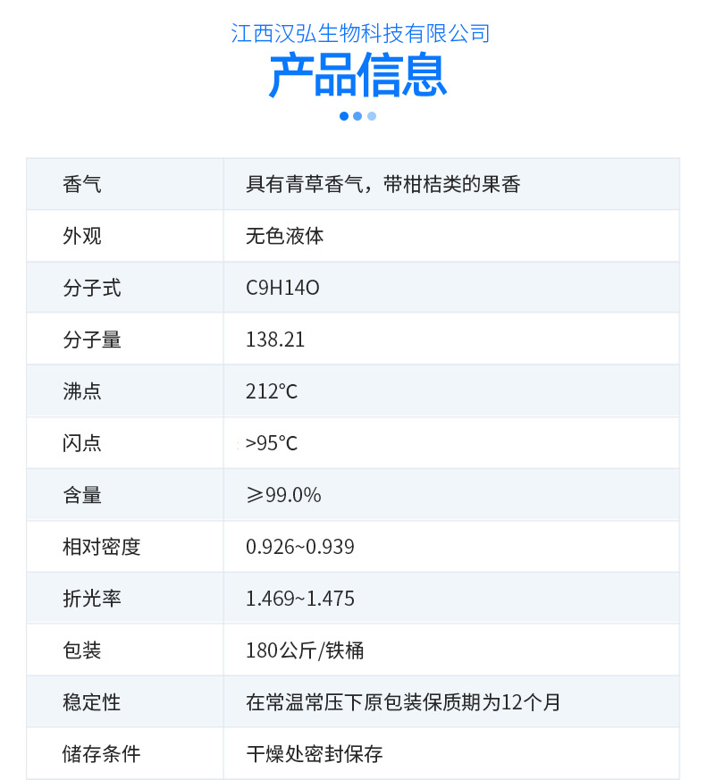江西汉弘生物科技有限公司位于素有“江南望郡”之称的江西省吉安市,是集国内、国外贸易为一体的综合性公司,经销产品包含植物性天然香料、合成香料、医药中间体等百余品种。公司拥有完善的生产基地,高科技仪器设备,雄厚的技术力量和有经验的科研队伍,由长达二十余年从事香精香料技术开发的调香科研人员及管理人员组成,并和国内外多家先进的香精香料公司有着长久稳固的合作。汉弘生物一贯坚持“质量为先,信誉为重,管理为本,服务为诚”的经营理念,服务于广大企业客户朋友,发扬“团结、奋进、求实、创新”的精神,在国内外建立了完善的采销网络,为市场源源不断地输出高品质产品。欢迎各界朋友莅临参观、指导和业务洽谈。