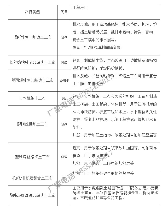 5、土工布按原料不同,分为 ① 涤纶短纤针刺非织造土工布;② 聚丙烯短纤针刺非织造土工布;③ 聚酯长丝纺粘针刺非织造土工布;④ 丙纶长丝机织土工布;⑤ 涤纶长丝机织土工布; ⑥玄武岩纤维机织土工布;⑦聚丙烯裂膜丝机织土工布;⑧ 塑料扁丝编织土工布;⑨ 聚酯玻纤湿法非织造土工布。