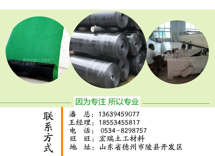 厂家产品被应用于:景观人工湖、生活污水处理场、垃圾填埋场防渗,公路铁路路基加筋、挡土墙加筋、公路养护、水利护坡、水库防渗、人工湖防渗、电厂灰坝处理、污水调节池防渗、尾矿坝防渗、化工污水池防渗、水产养殖池塘防渗、油罐基础防渗、高速边坡防渗加固、危险固废物填埋场防渗、金银铜铁锌镍尾矿坝防渗、人工湖防渗、沉淀池防渗、淀粉浆池防渗、油田污水池防渗、屋顶绿化工程防渗、地下建筑工程防渗、粮食储备库防潮、盐场晒盐卤水池防渗等基础建设领域,已被广泛应用于环保、高速公路、铁路、高尔夫等300多项国家重点工程,积累了相当丰富的工程经验,德州宏瑞土工材料厂的诚信、实力和产品质量获得业界的认可及广大用户的一致好评!