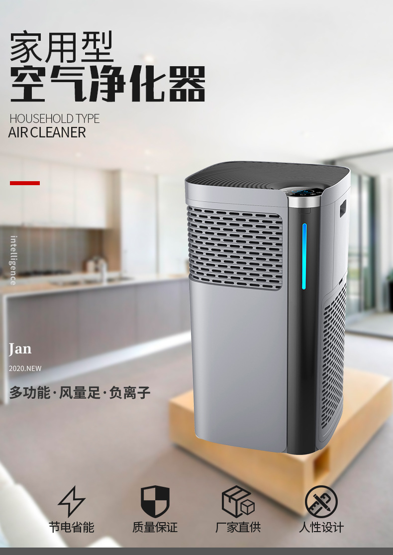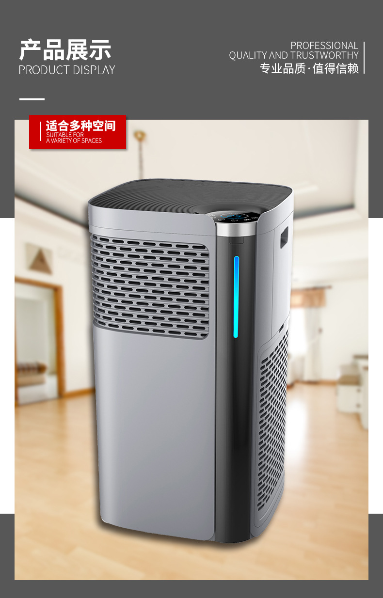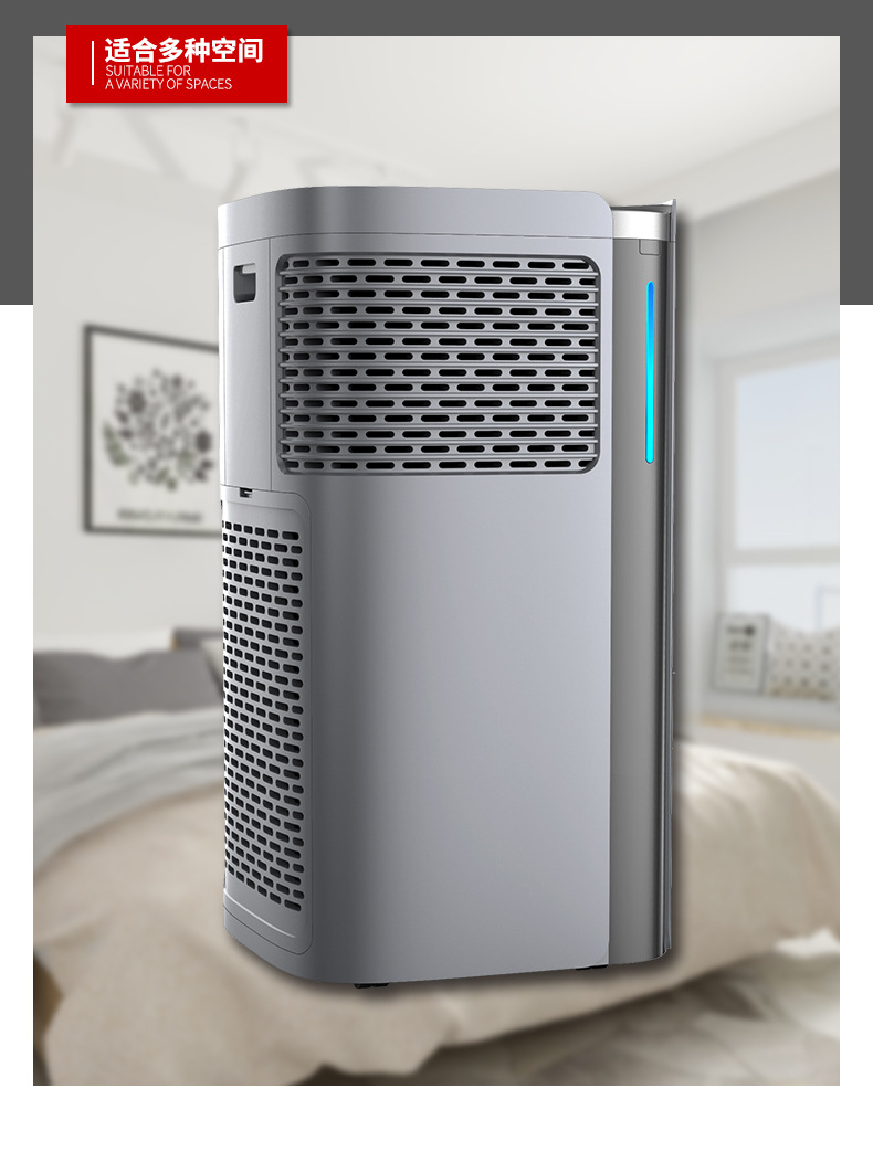 产品优势说明:外观颜色目前常做的有白色、灰色双涡轮进风设计,颜色方面也可以根据客户的要求具体订做;移动脚轮设计;手机APP控制,全球通用;通过紫外线杀菌消毒不会对人体造成任何的伤害,又可以通过滤网净化室内中的颗粒物和及有害物质细菌、病毒等。