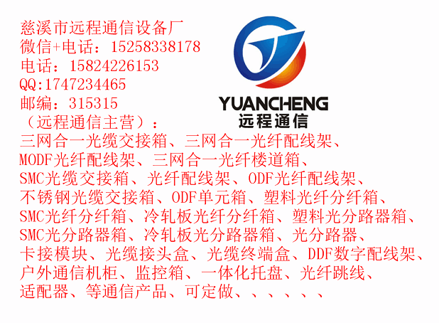 慈溪市远程通信设备厂:OMDF光纤总配线架、ODF光纤配线架、光缆交接箱,三网合一箱、四网合一箱、光缆分纤箱,分光分纤箱,光缆分线盒,光缆接头盒,光缆终端盒,冷接子,快速连接器,跳线,配线光缆、皮线光缆、市内布线光缆、无源器件、线路辅助设施等。