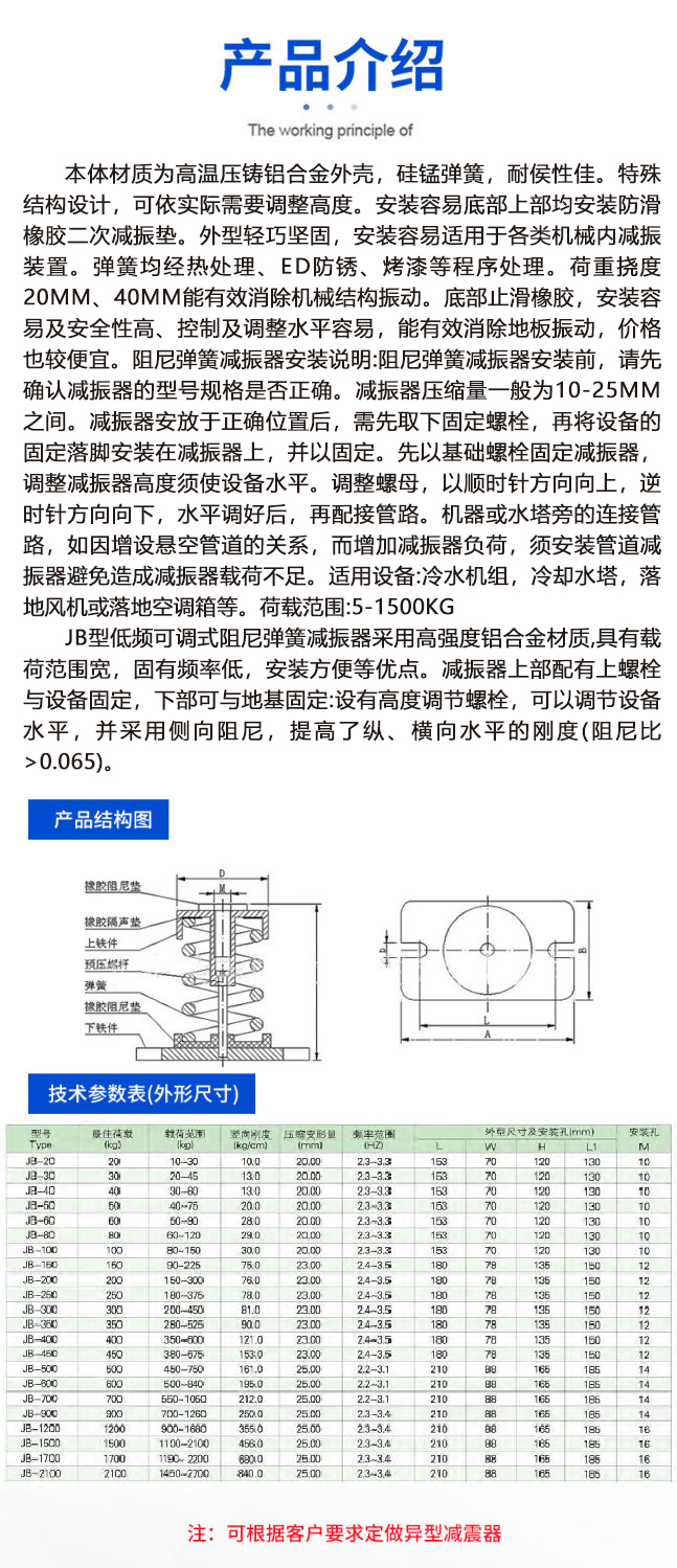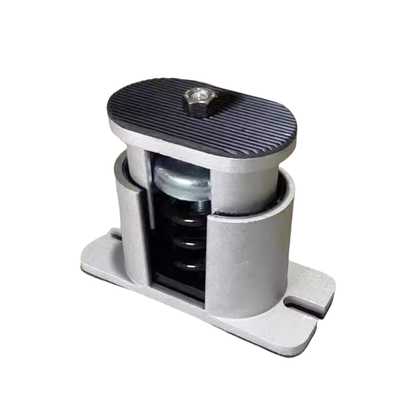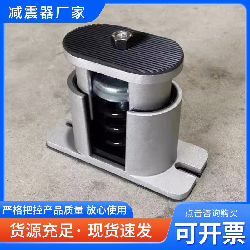 JB型低频可调式阻尼弹簧减振器采用高强度铝合金材质,具有载荷范围宽,固有频率低,安装方便等优点。减振器上部配有上螺栓与设备固定,下部可与地基固定:设有高度调节螺栓,可以调节设备水平,并采用侧向阻尼,提高了纵、横向水平的刚度(阻尼比>0.065)。