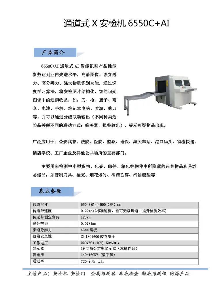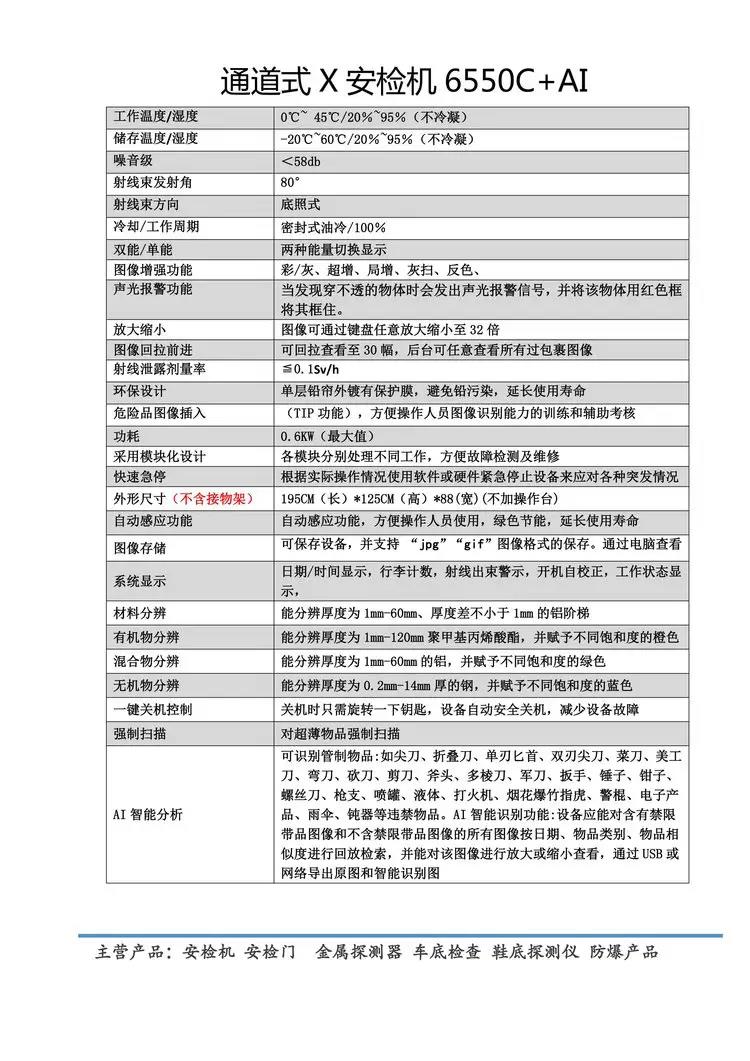 6550CAI通道式AI智能识别产品性能参数达到业内先进水平,高清图像、强穿透力、高分辨力、强大物质识别功能. 通过深度学习算法,将安检图片结构化,智能识别图像中的违禁物品,如:刀、瓶子、雨伞、电池、手机、笔记本电脑、喷灌、剪刀等。并可以通过分级联动输出(不同种类危险品关联不同的联动方式:蜂鸣器,报警输出),提示可疑物品出现。