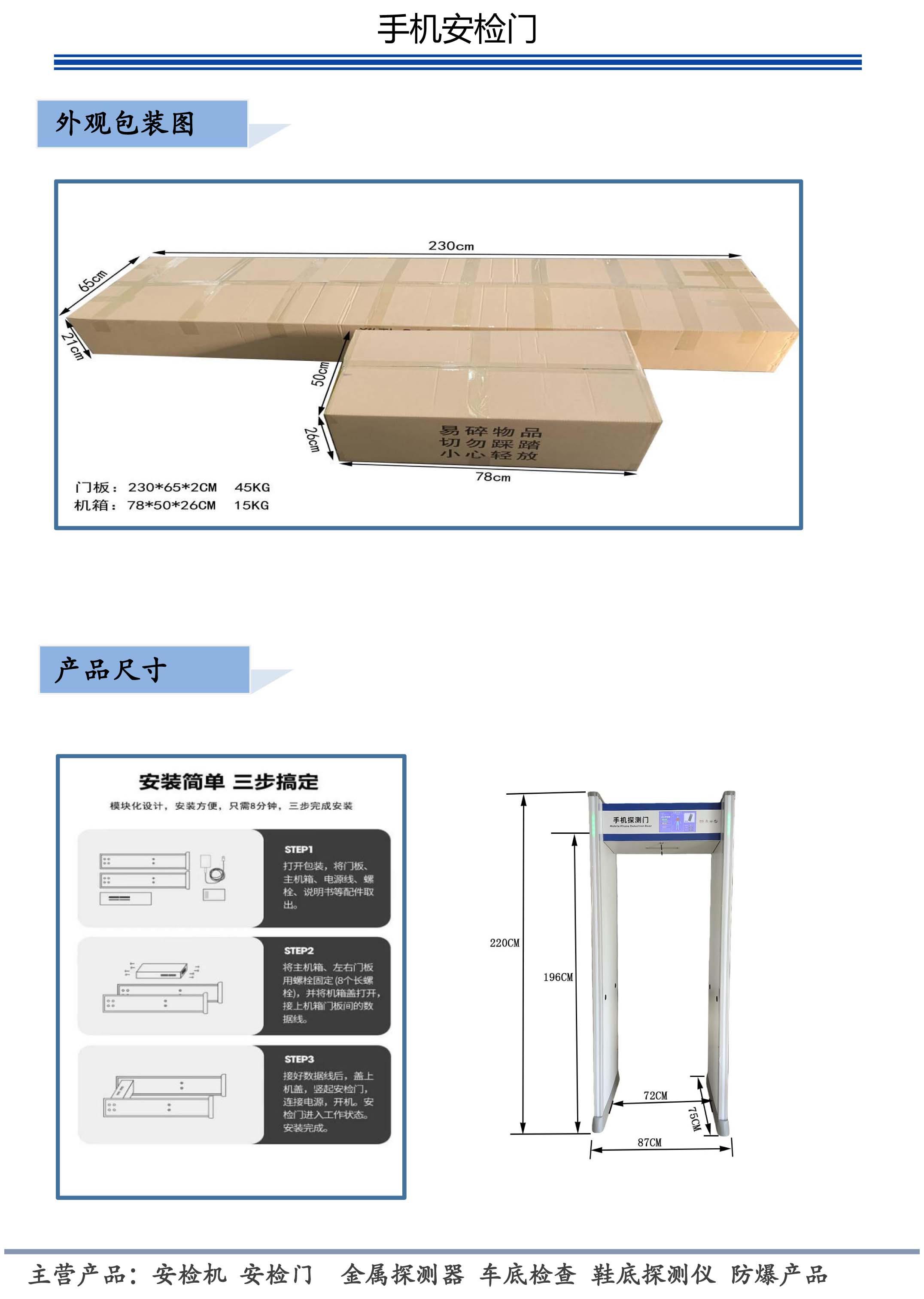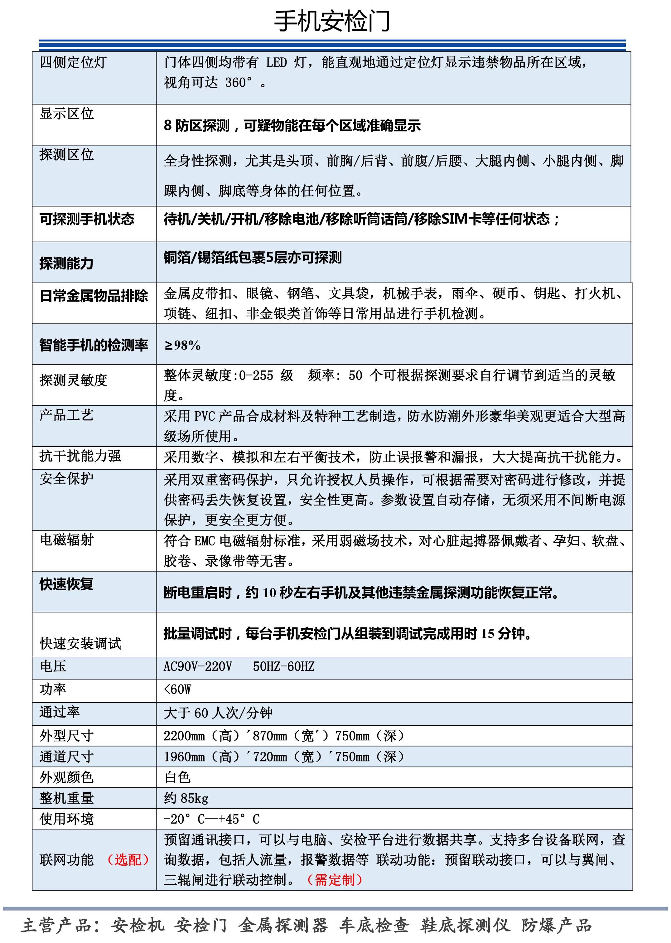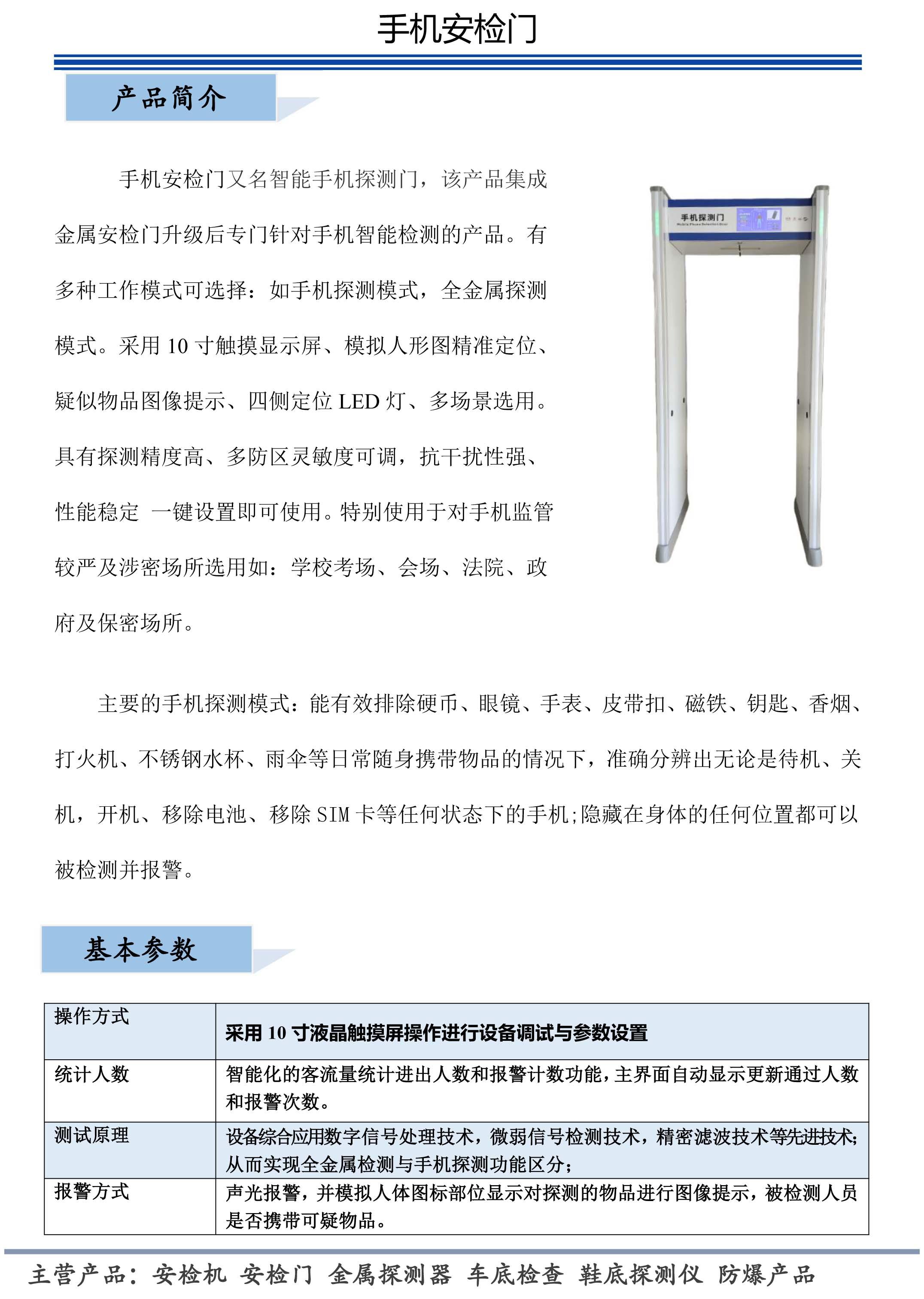 手机安检门又名智能手机探测门,该产品集成金属安检门升级后专门针对手机智能检测的产品。有多种工作模式可选择:如手机探测模式,全金属探测模式。采用10寸触摸显示屏、模拟人形图定位、疑似物品图像提示、四侧定位LED灯、多场景选用。具有探测精度高、多防区灵敏度可调,抗干扰性强、性能稳定 一键设置即可使用。特别使用于对手机监管较严及涉密场所选用如:学校考场、会场、法院、及保密场所。