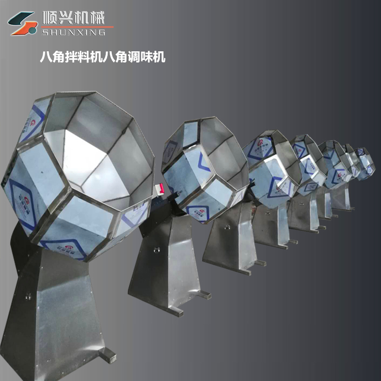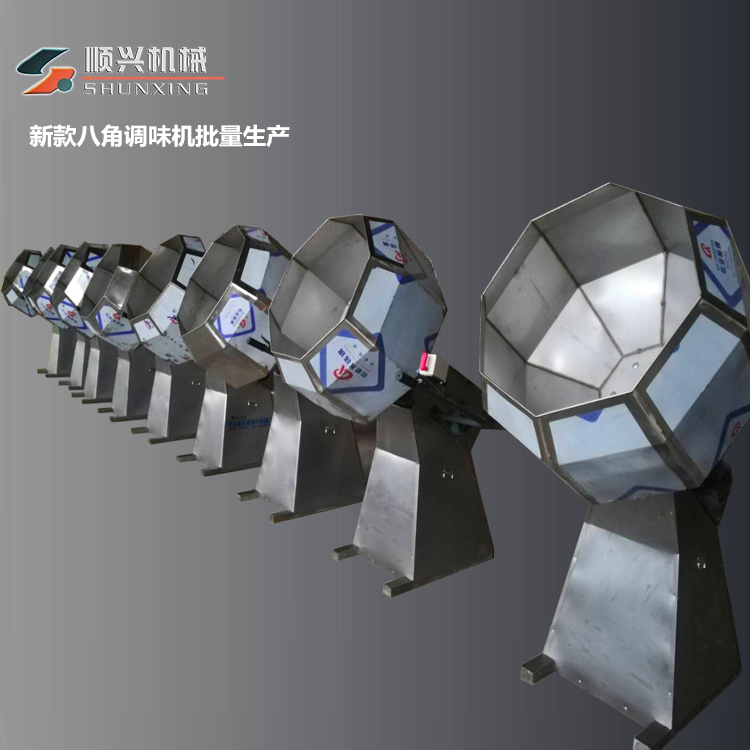 顺兴八角拌料机适用于食品的后期调味、上粉搅拌或原料的裹衣包粉以及掺和,可用于油炸蚕豆、锅巴、花生米、牛肉干、薯条薯片、坚果、酱菜等多种食品的调味拌料工作。