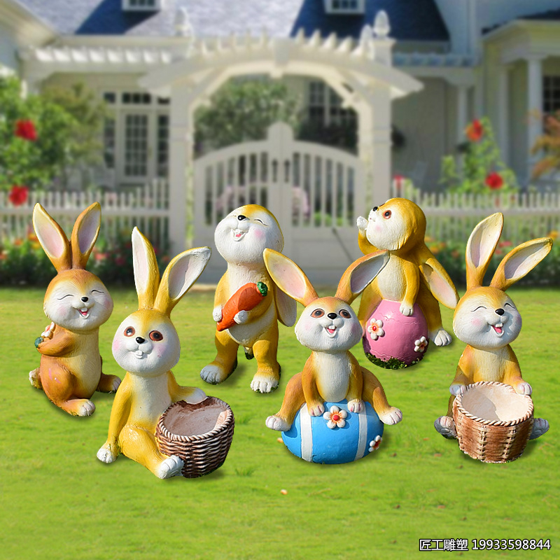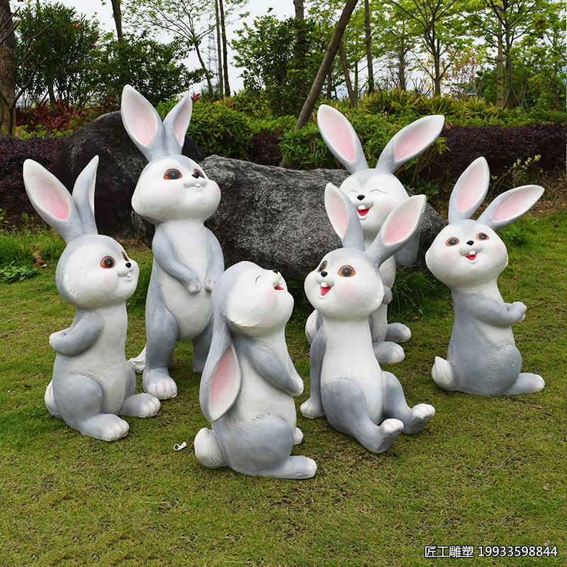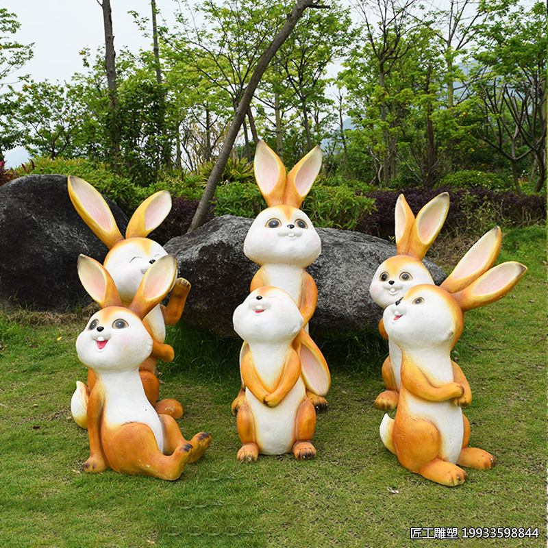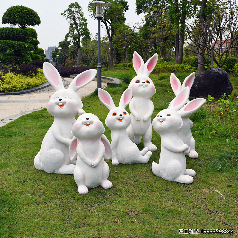 以兔子为主题的群体雕塑,通常采用拟人化手法,通过夸张的比例、生动的姿态和丰富的表情,打造出或憨态可掬、或灵动俏皮的视觉形象。例如,一组兔子雕塑可能包含站立、跳跃、蹲坐等不同动态,搭配胡萝卜、蘑菇等道具,形成叙事性场景,增强互动感和故事性。