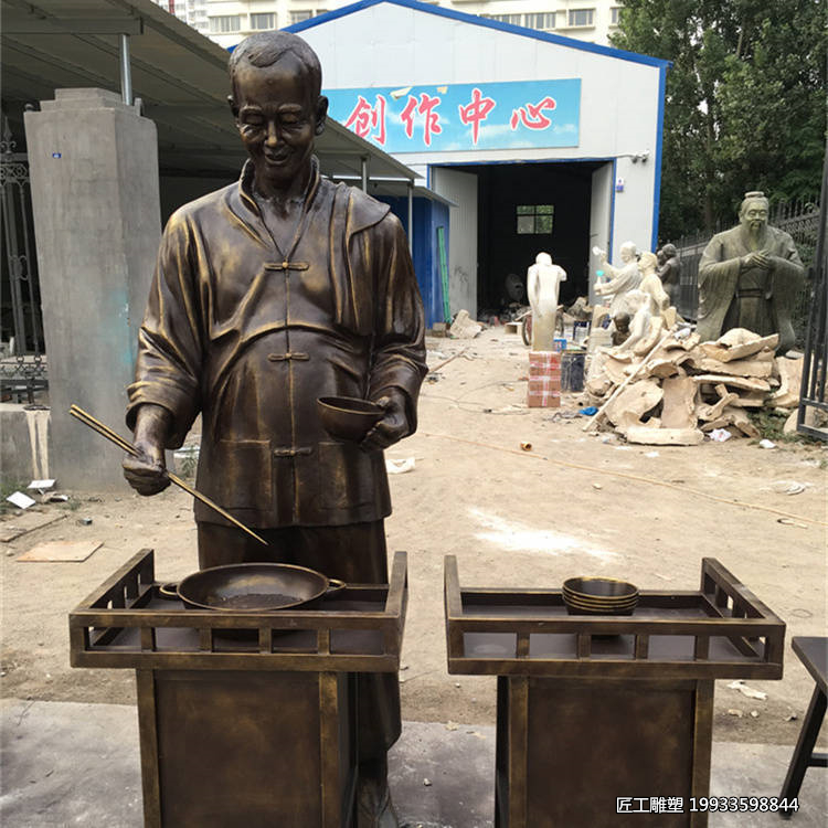 在这件玻璃钢吃面条人物仿铜装饰摆件雕塑中,艺术家巧妙捕捉了一个日常生活的瞬间——一位普通人正专注地享用一碗面条。这个场景平凡而又真实,却因艺术家的匠心独运而变得不平凡。