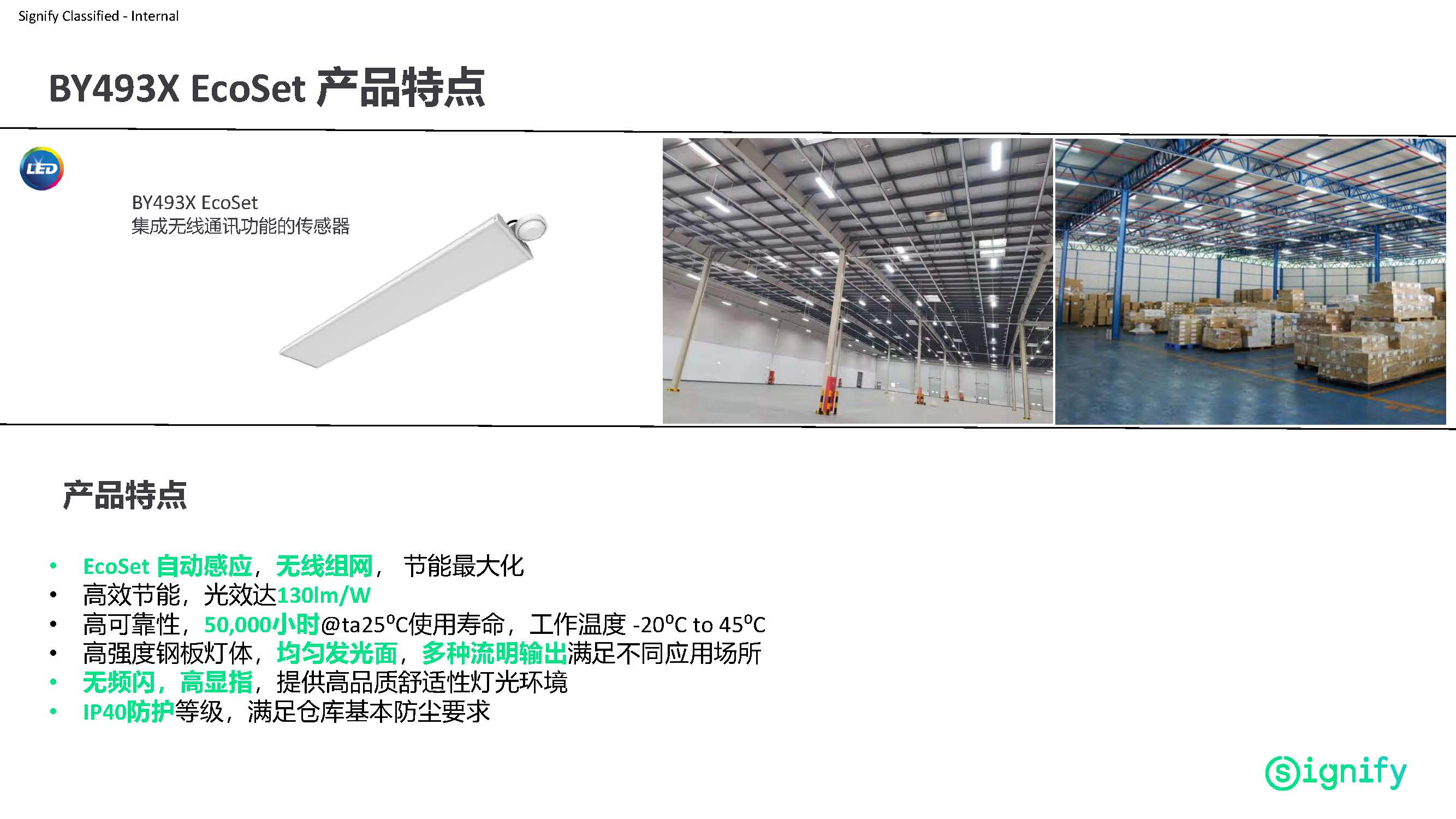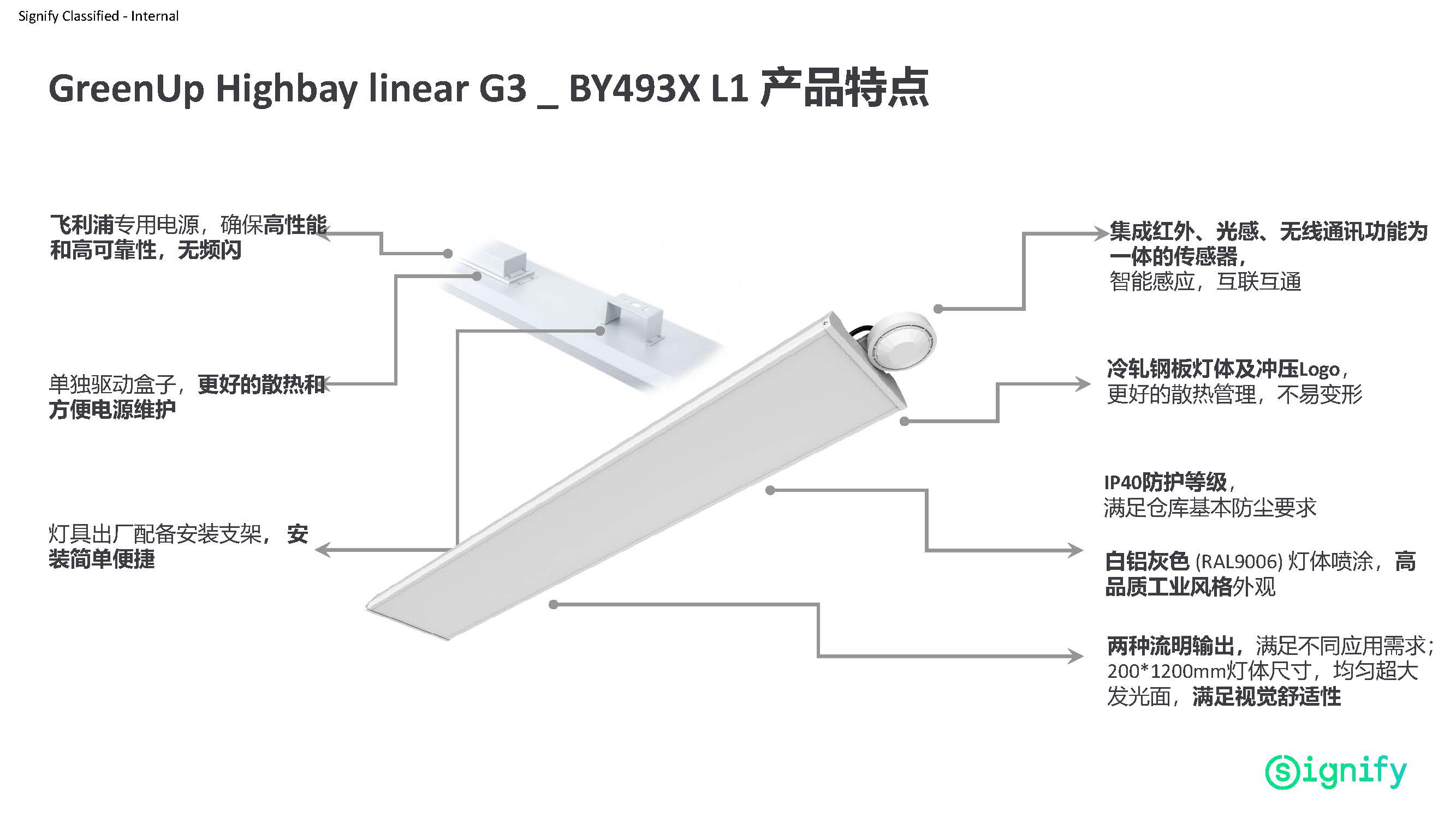 GreenUp Hiay Linear G3 BY493P是第三代高性价比的条形高天棚灯,高光效、高可靠性,满足物流仓库照明标准要求,1.2米长度尺寸,高流明输出,均匀发光面,高强度冷轧钢板灯体白铝灰色高温喷涂,适用于物流仓库等高空间的工业场所应用。EcoSet轻智能版可以通过传感器远距离感应人或者叉车的靠近,来判断输出功率的高低,实现无人时20%低功耗输出,有人作业时100%高功率输出,以此达到进一步节能的目的。还可