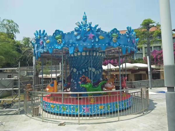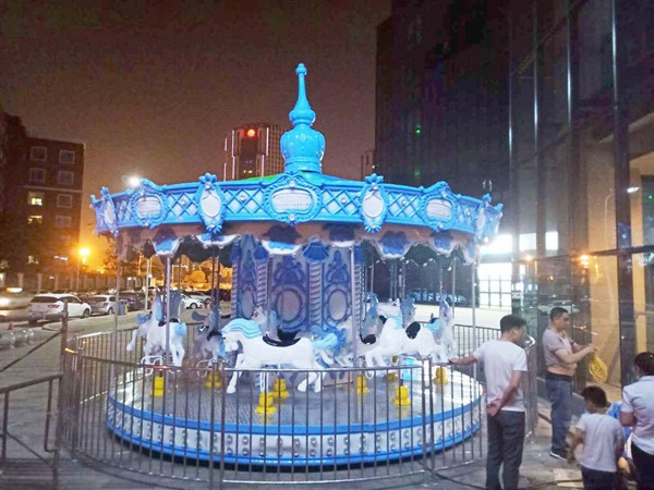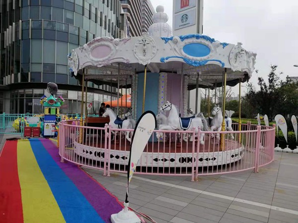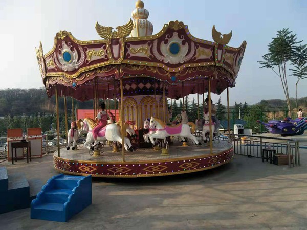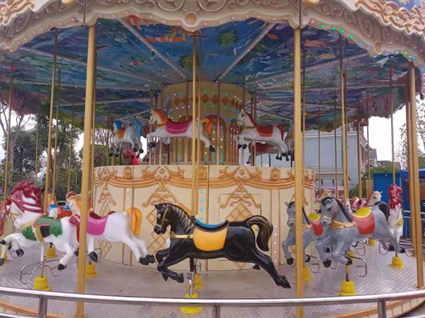 旋转木马又可以称为豪华转马,是比较经典游乐设备,模拟跑马厅的活动而设计的,该游艺机的上部设有彩色的锥形顶棚,顶棚的周圈装有五彩缤纷的玻璃钢装饰板,更显豪华气派,俨如华丽的跑马厅。