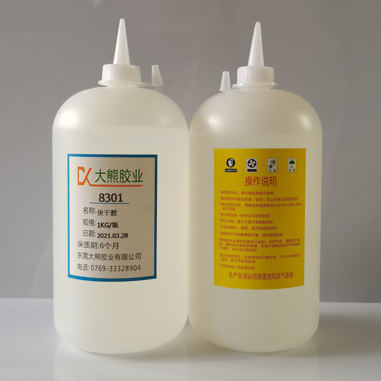 大熊胶业PP塑胶制品瞬干胶8301,低粘度瞬干型速干胶适用于各种塑胶制品同一材质或不同材质之间的粘接,定位快,作业方便,定位后一般不会走位,10分钟基本达到破坏的牢固强度。