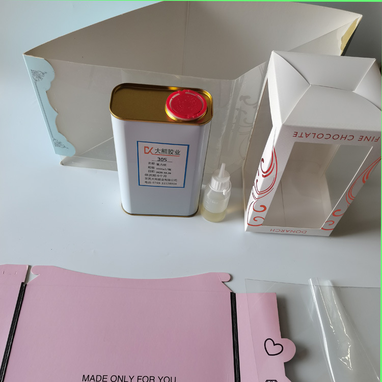 大熊胶业树酯胶305,应用广,塑胶、卡纸,过膜卡纸,皮革、橡胶、泡棉、纸制品、金属、(EVA、PP、PVC、PS、PA、ABS、PET、PE)塑胶片等互相之间粘接,对多孔性材质好粘、手工使用更简便,流水线工厂均可适用,也适用于不同材质的大面积复合粘接,主要用于防震件、箱包、手袋钱包、鞋、高要求纸塑包装盒、蛋糕盒、彩盒天窗、运动器材、气密性产品密封等粘贴,定位快,粘接牢固,对于单、双面过膜的彩盒粘PET、PVC胶片,不仅粘接力强,粘接快,还透明无胶痕。