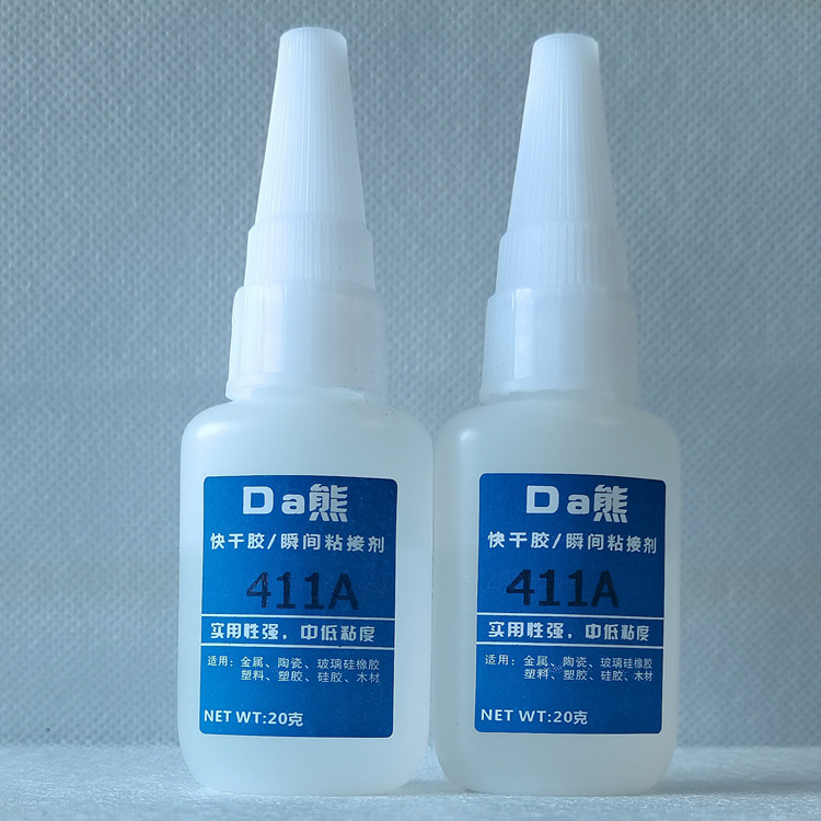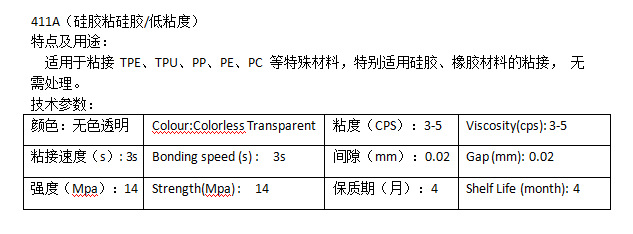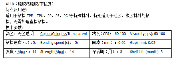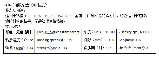 采用411A/411B快干胶,对硅胶、橡胶、其它塑料制品粘接时不用处理塑料表面就可以直接粘接,416更适合硅橡胶塑料与金属,五金件的粘接。