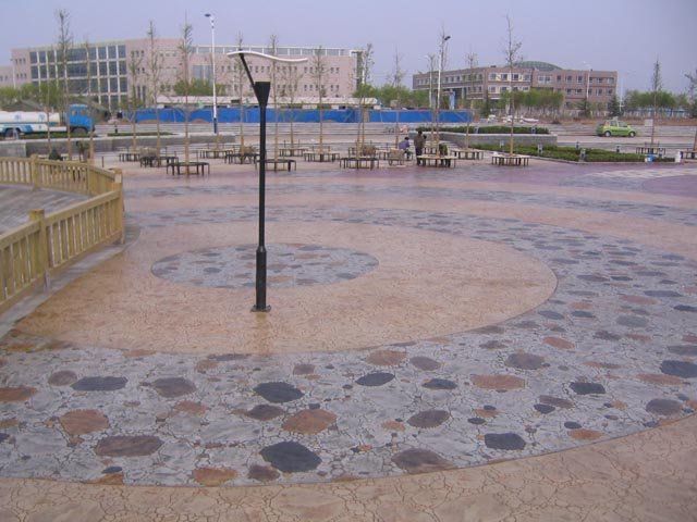 上海鹤权景观工程有限公司是国内较早引进欧美现浇彩色混凝土压模地坪专利技术的企业,在引进、吸收、创新的过程中发展自主品牌---鹤权彩色混凝土压模地坪,这一当今国际刚流行的高科技项目已在上海及南方主要城市得到大面积推广,压模地坪具有一次成型、使用期长、施工快、抗压耐磨等优点,同时又解决了普通彩色道板的整体性差,高低不平、易松动、使用周期短等缺点,彩色混凝土压模地坪是目前广场彩色砖、彩色道板的理想替代产品。
